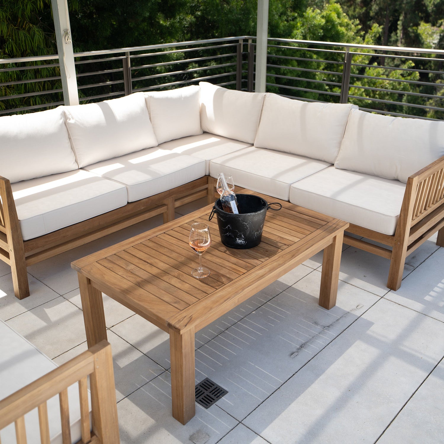 Elevate your patio, deck, or backyard lounge with our premium natural teak outdoor coffee table. Crafted from sustainably sourced, teak, this table showcases a rich natural finish that highlights the timeless grain and golden tones of the wood. Built to withstand the elements, it’s the perfect surface for relaxing with drinks, hosting casual conversations, or styling with your favorite decor. Its versatile, low-profile design pairs seamlessly with any outdoor sofa, lounge chairs, or sectionals.