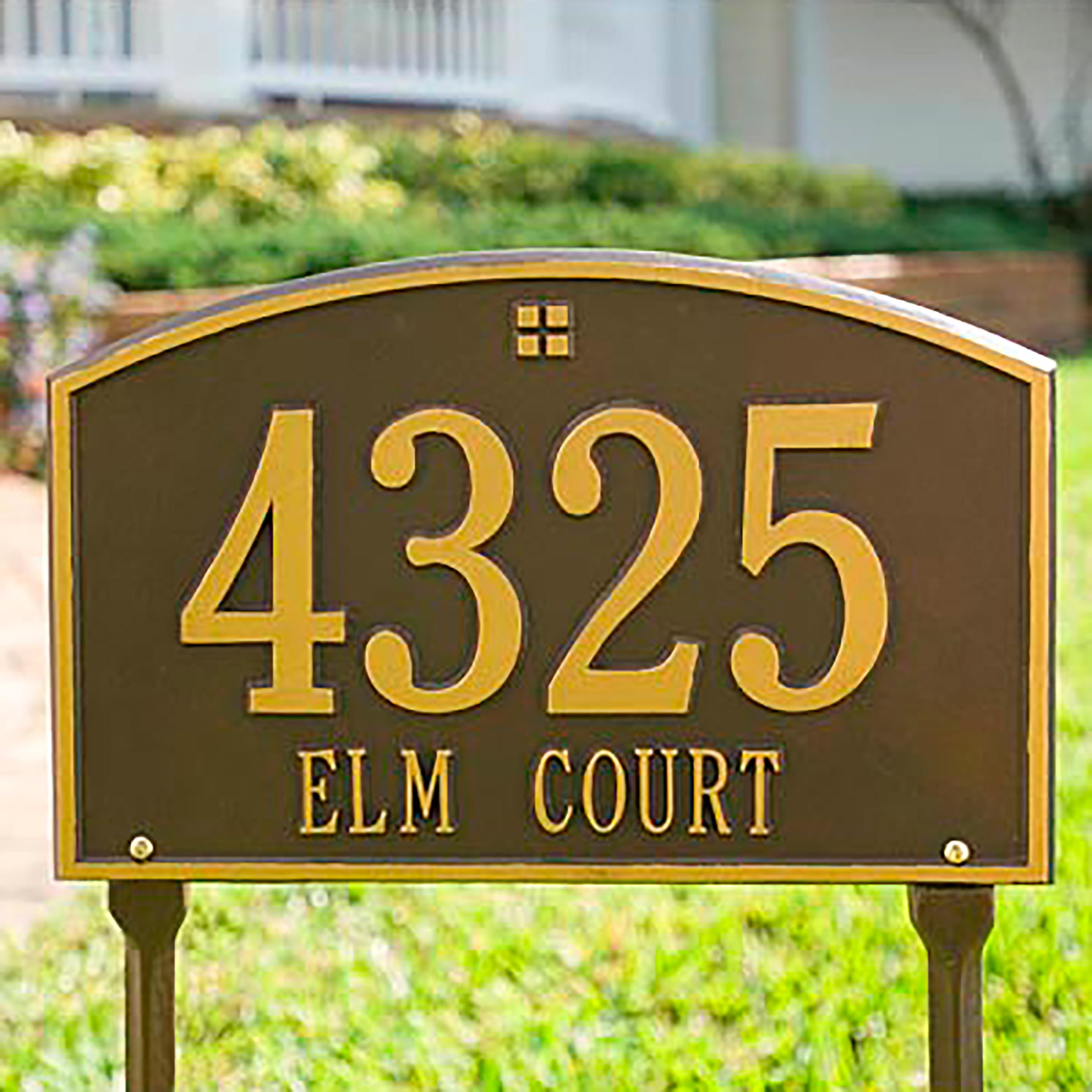 Custom-made in the USA from recycled cast aluminum, our Cape Charles Wall And Lawn Plaques feature raised gold-hued lettering on your choice of background color. Powder-coat finish protects them from the elements.