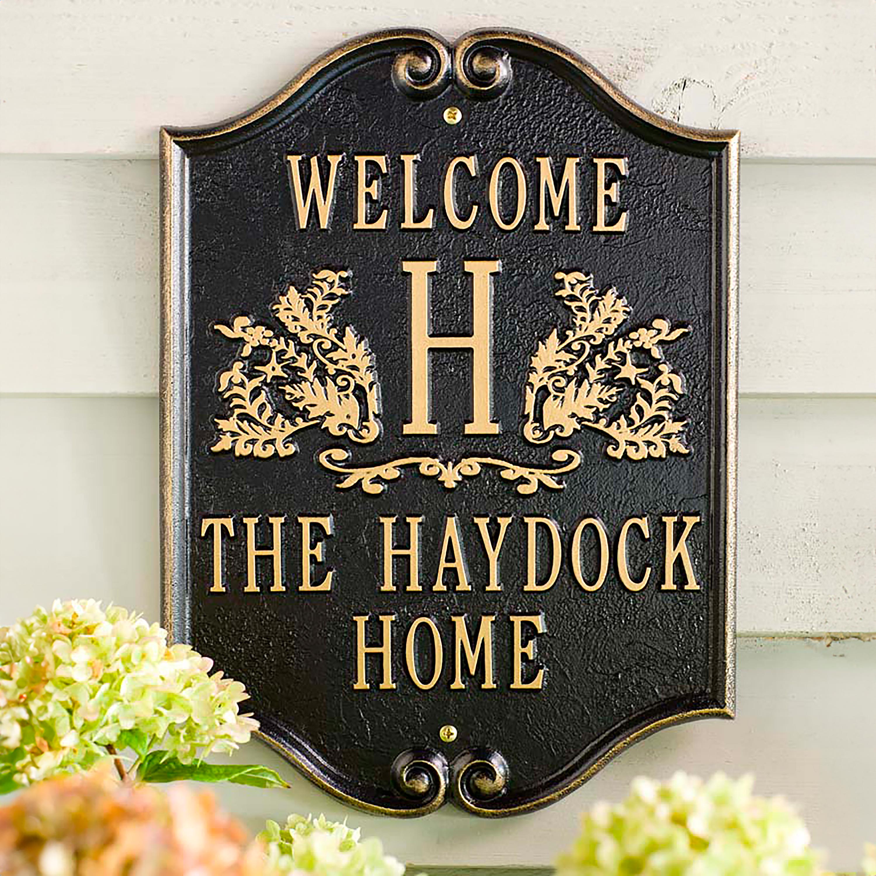 Welcome friends to your home with this stately welcome plaque. Made from cast aluminum in an all-weather finish, this elegant plaque features floral detailing and a raised border. Holds up to four lines of text (all words must be specified, no default words). Made in USA.