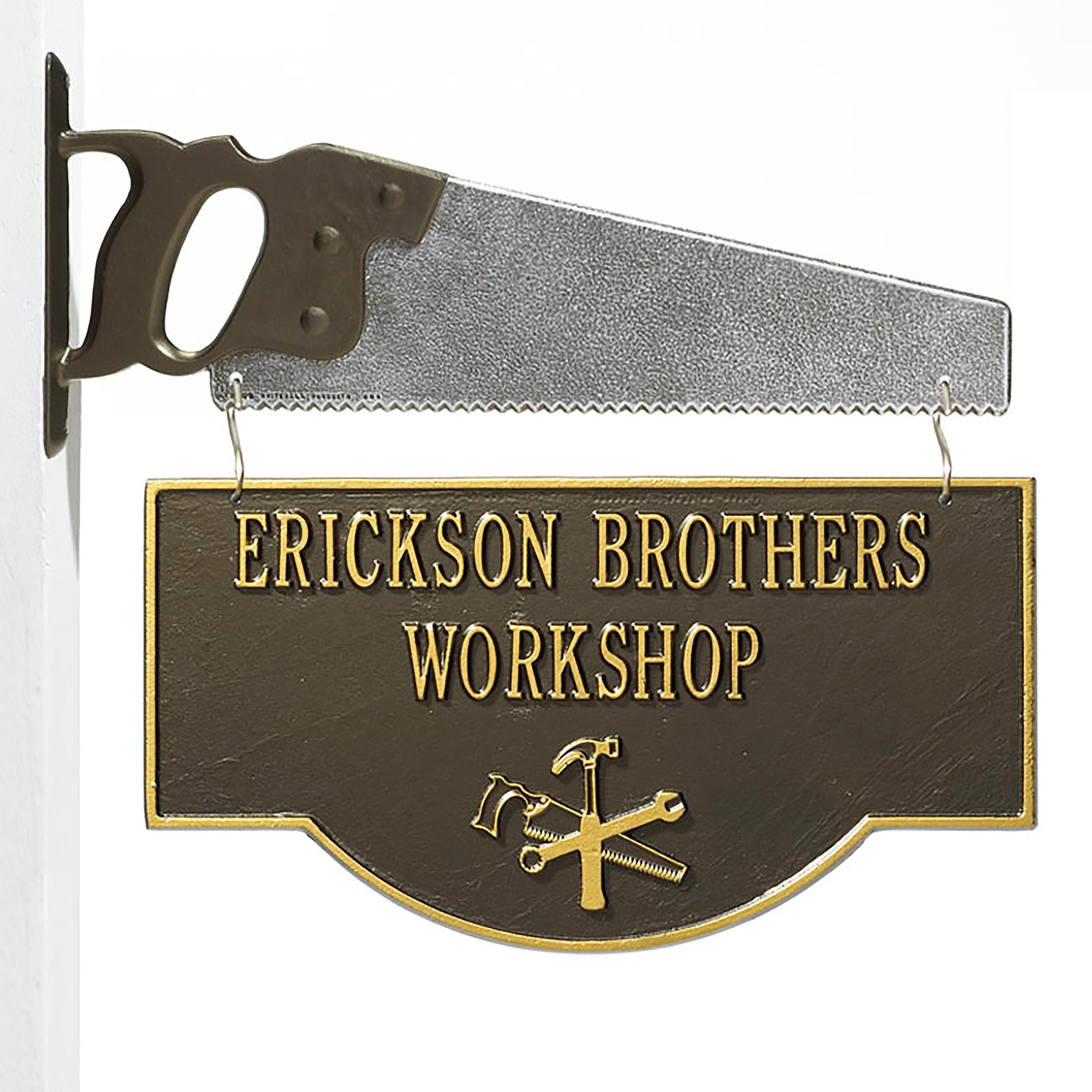 American-Made Personalized 2-Sided Workshop Sign With Saw Bracket In Cast Aluminum