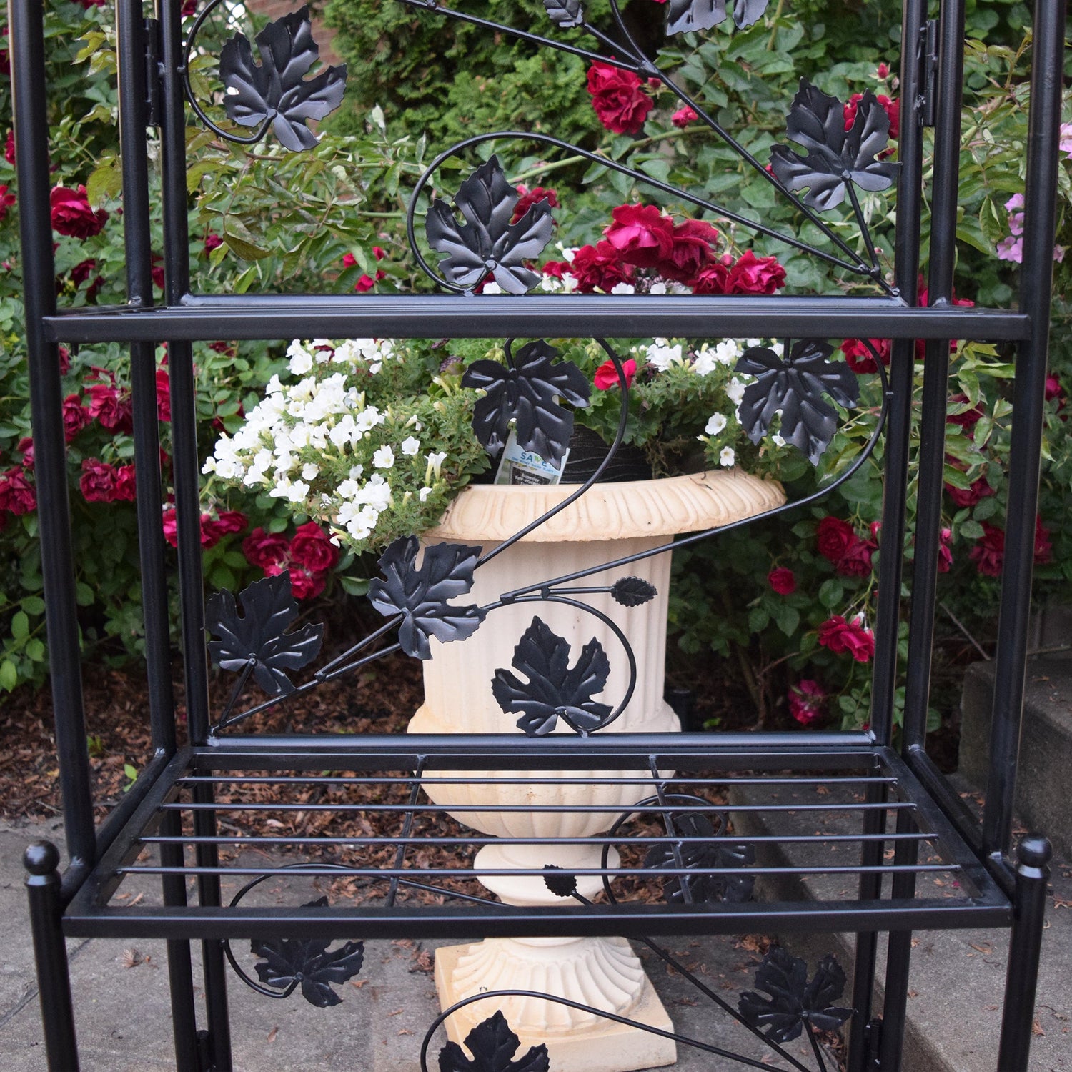This 4-tier black bakers rack offers a stylish and practical solution for organizing and displaying your plants and decorative items. Whether you place it indoors or outdoors, it adds a touch of elegance and sophistication to your living space. With its sturdy steel construction and weather-resistant finish, it's designed to last and maintain its beauty even in outdoor environments. Enjoy the versatility and beauty of this tall 4-tier plant stand bakers rack in your home or garden.