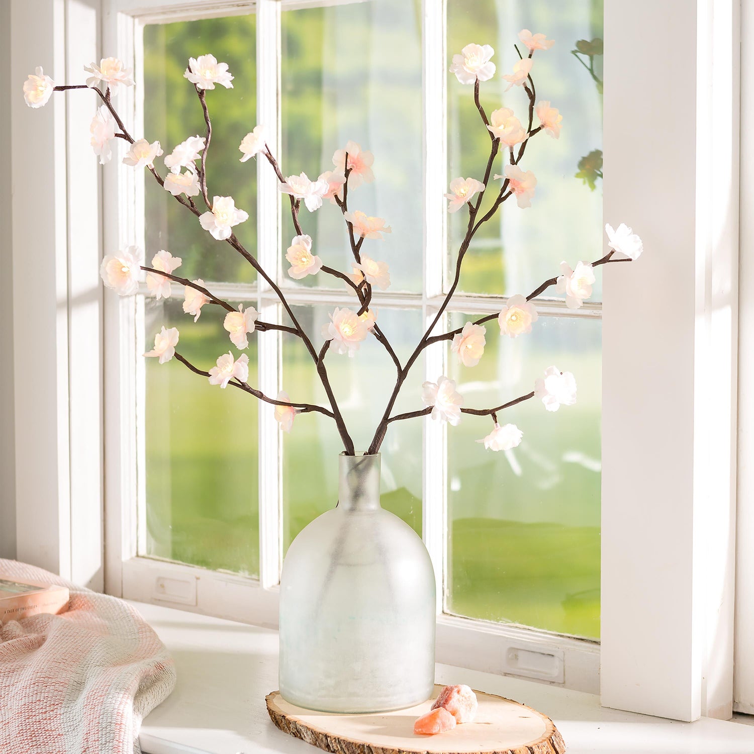 These graceful branches add instant elegance with beautiful flowers and warm white LEDs. Place the branches in a vase and display as a centerpiece on the dining table, on a nightstand or the mantel. They add no-fuss color and glow anywhere with no watering or fading like real flowers.