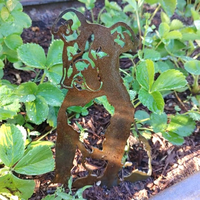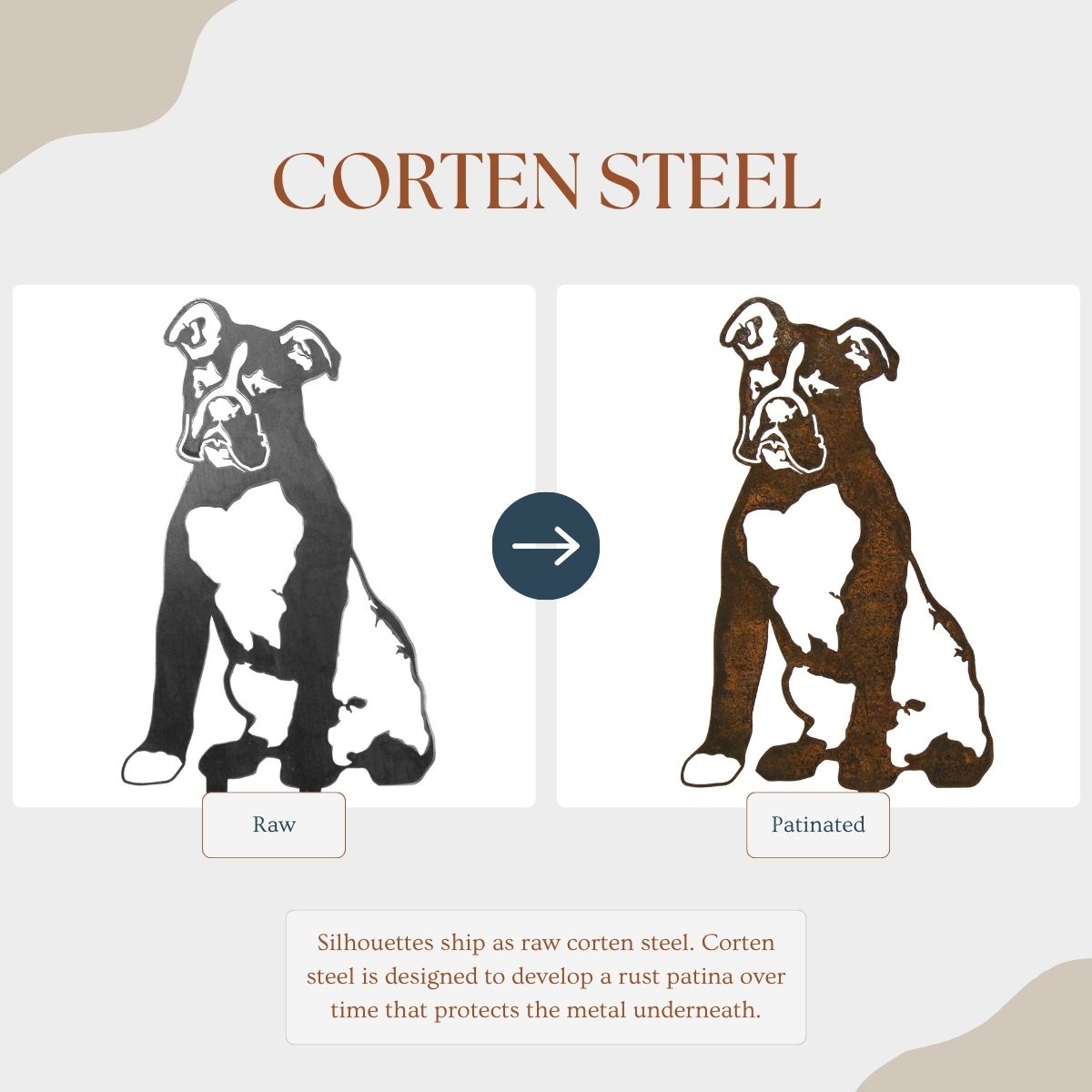 The Corten steel finish is designed to develop a beautiful patina rust coating that will change over time, protecting the steel underneath. These silhouettes ship out as raw steel and will develop a patina if left in the weather or frequently exposed to wet conditions. The color of the patina should change over time, starting as brighter orange tones and changing to darker brown tones.
