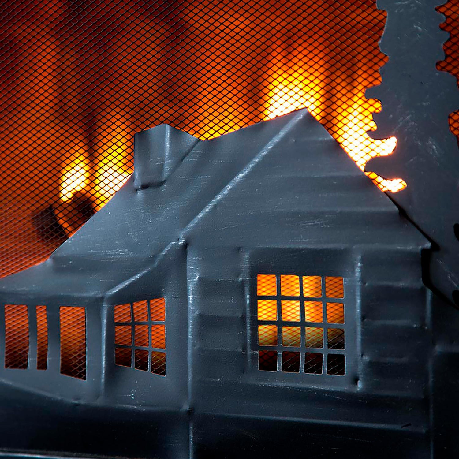 This unique fire screen with a laser cut mountain cabin design comes to life when you light a fire. Our exclusive screen features a detailed beveled cut mountain scene with a cozy cabin and pine trees.