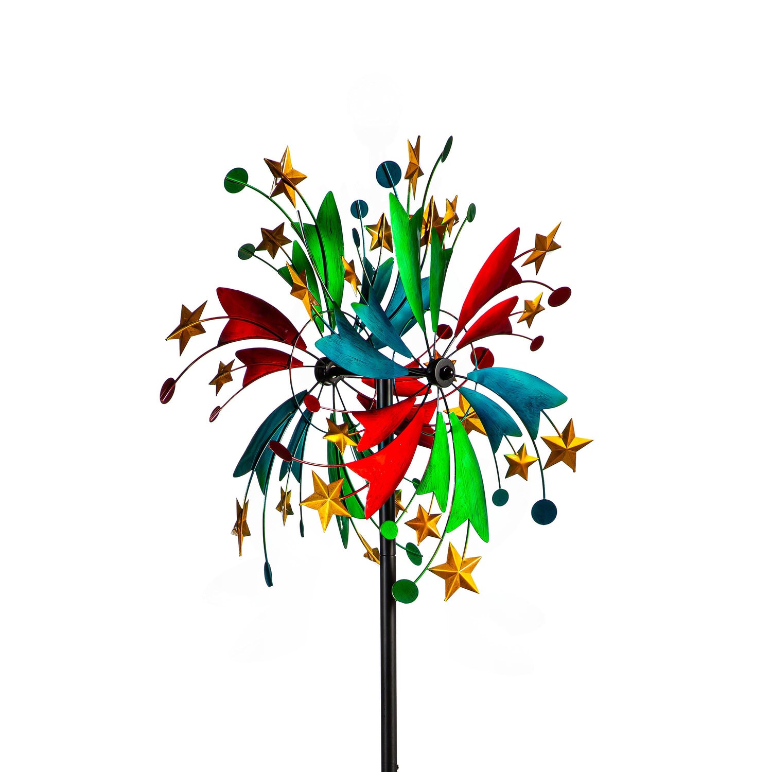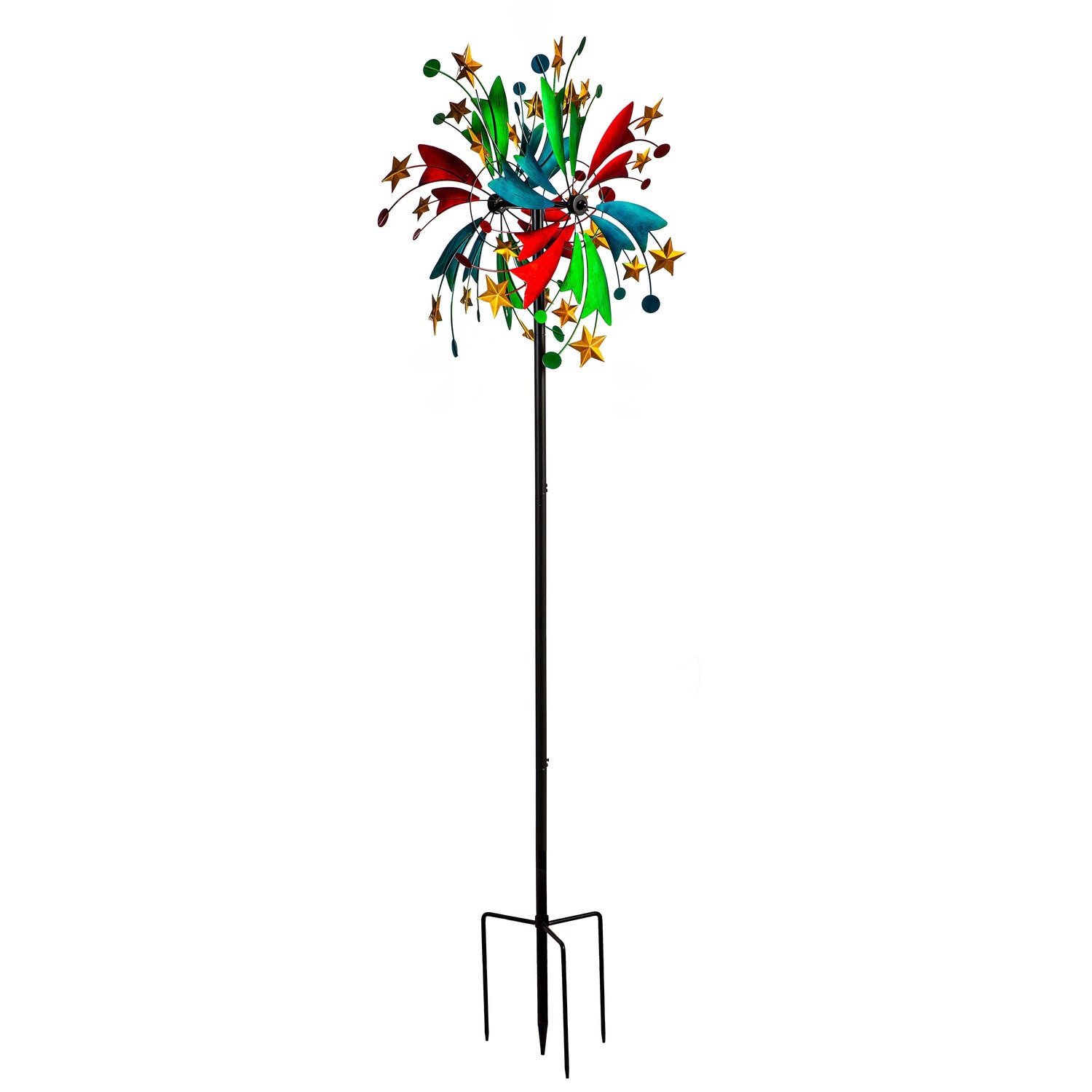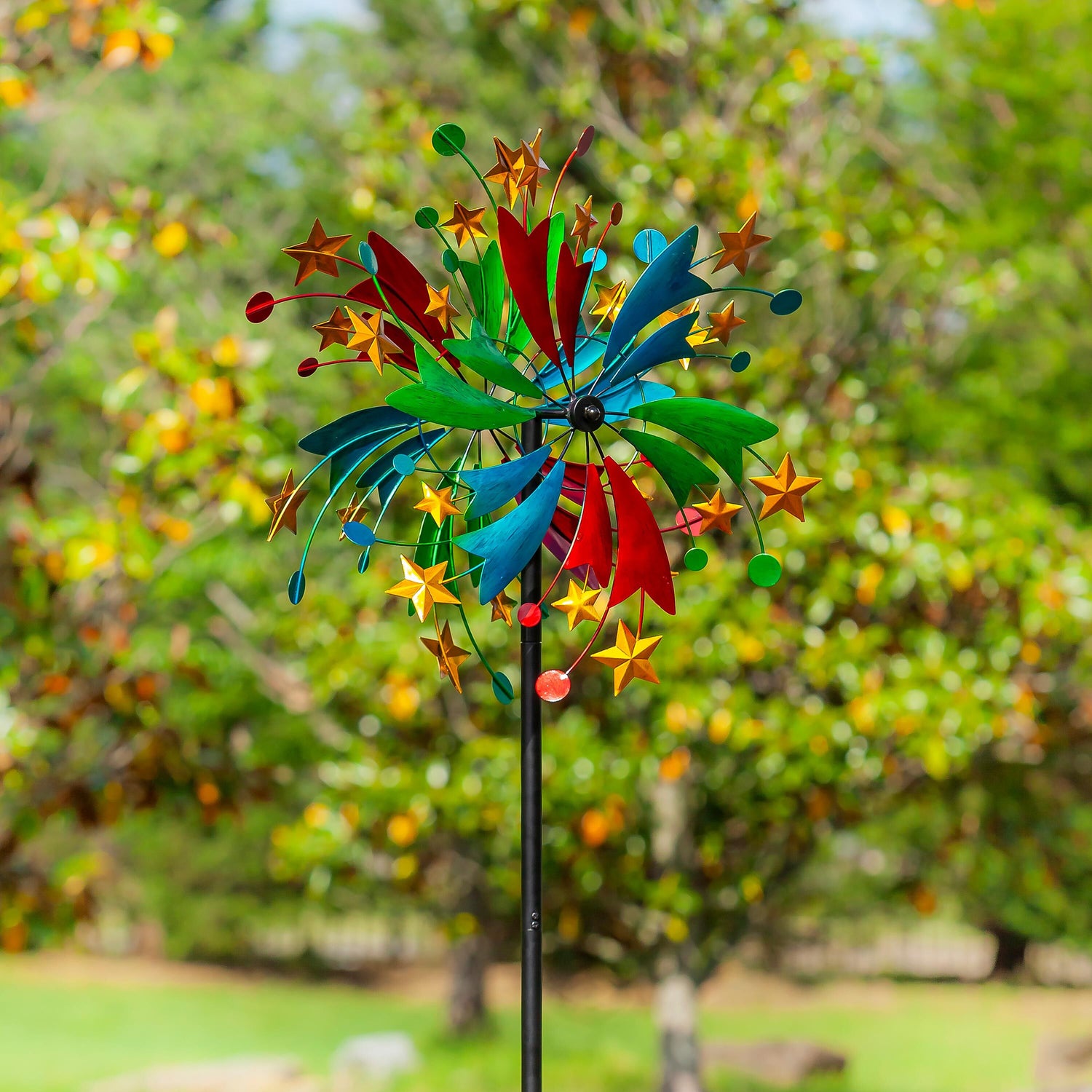 This Wind Spinner is perfect for adding color and whimsy to any outdoor space, garden, landscaping and more. The spinner is designed for movement when the wind blows; sit back and watch as the design comes to life in any gentle breeze. Its beautiful celestial design bursting with color and featuring star accents is an easy way to bring charm to any home. Made of durable, weather-resistant material, this outdoor accent is made to last year after year.