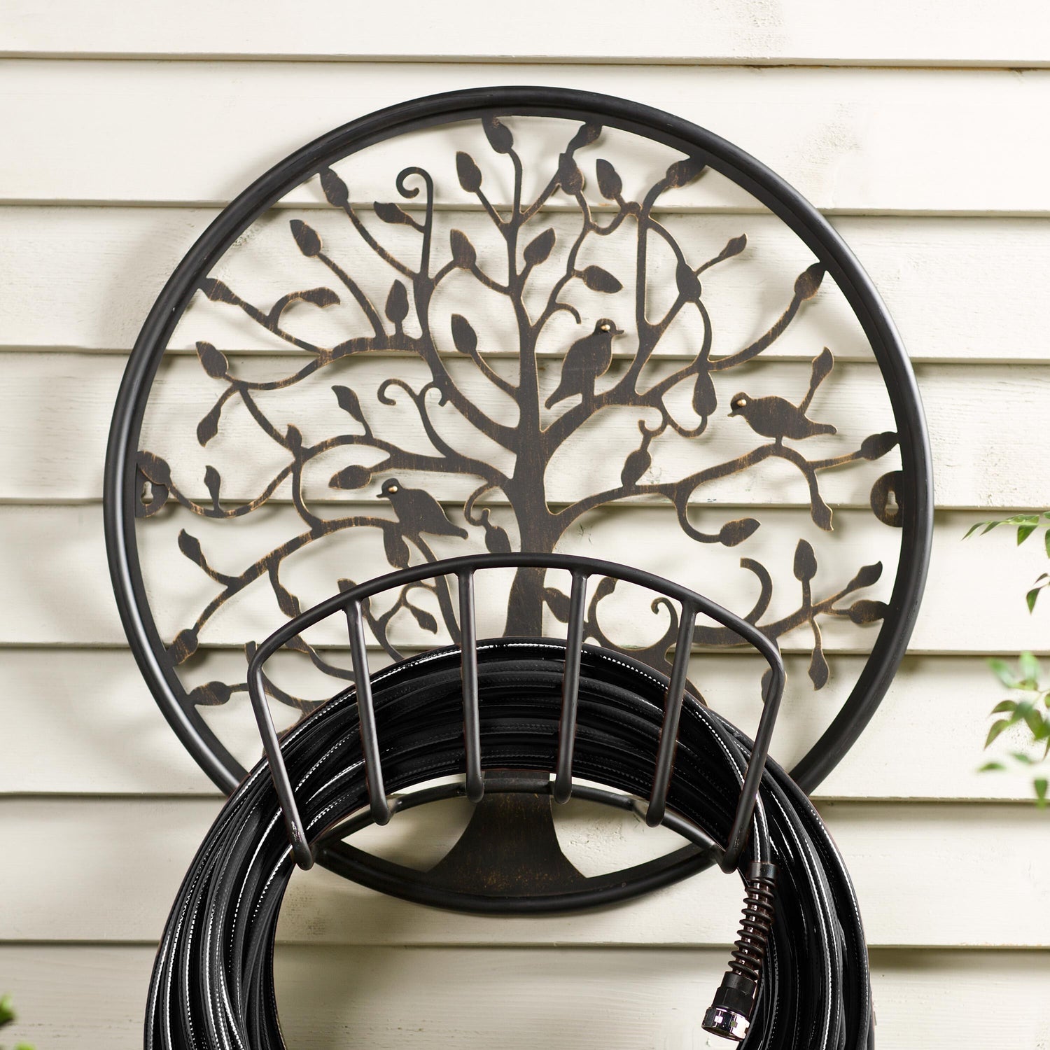 Mount our Tree of Life Metal Hose Holder to the side of your home or shed to tidy up your yard.