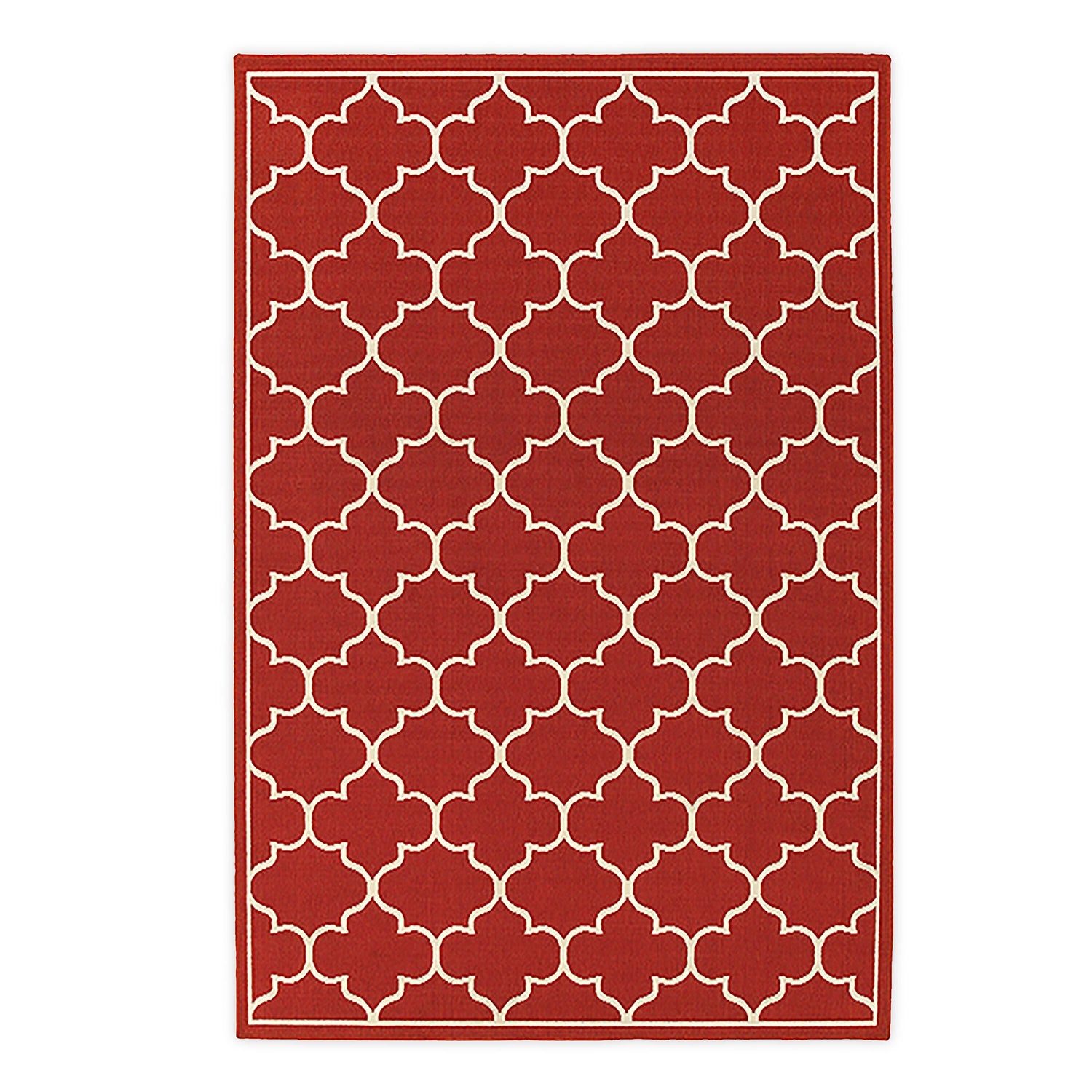 It simply hoses clean, qualifying it as another one of our easy-care rugs. Add softness to a patio or ultra durability for high-traffic areas inside the home. A simple, sophisticated quatrefoil pattern in a striking red updates your home’s look instantly. Imported.