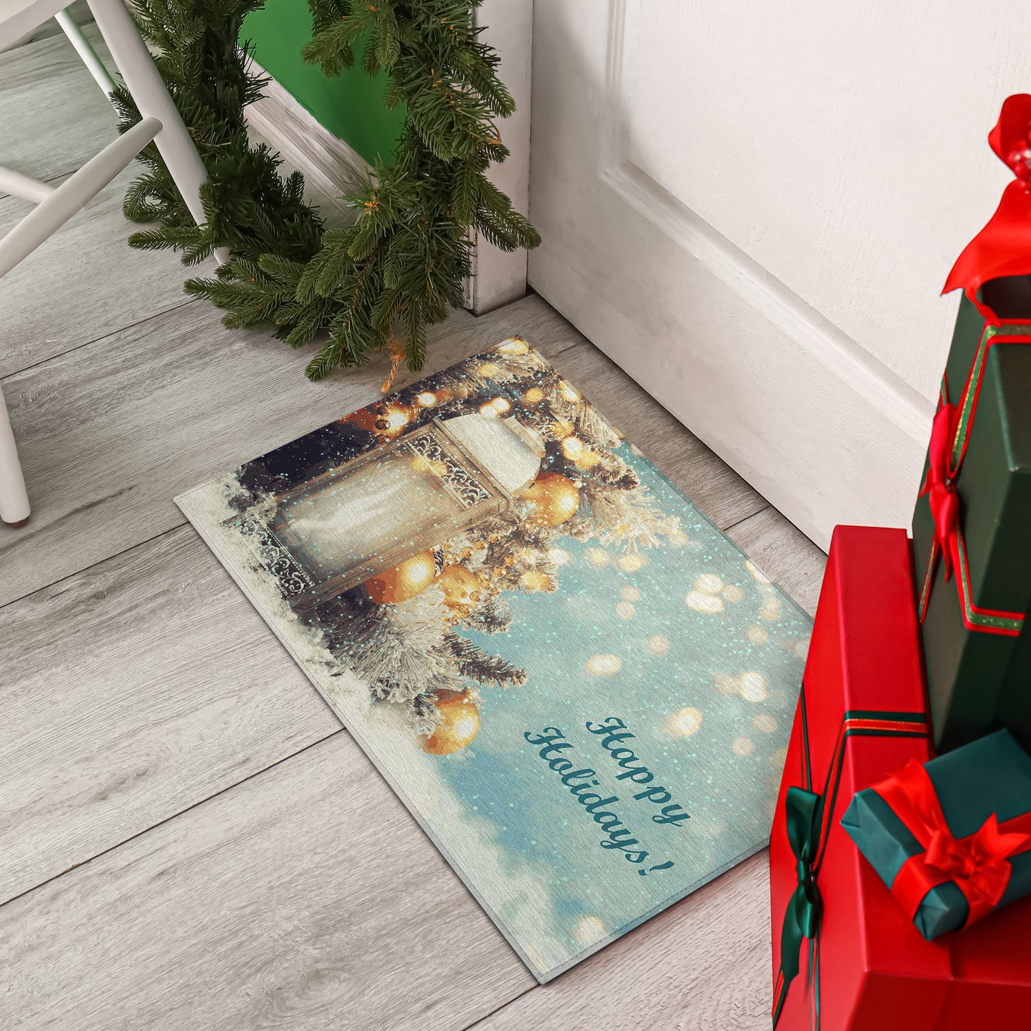 - Holiday-themed rug with lantern, ornaments, and frosted foliage
