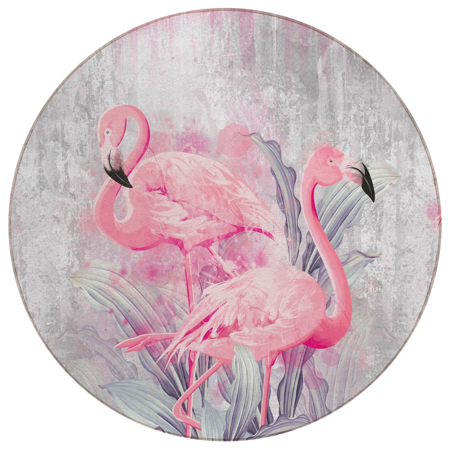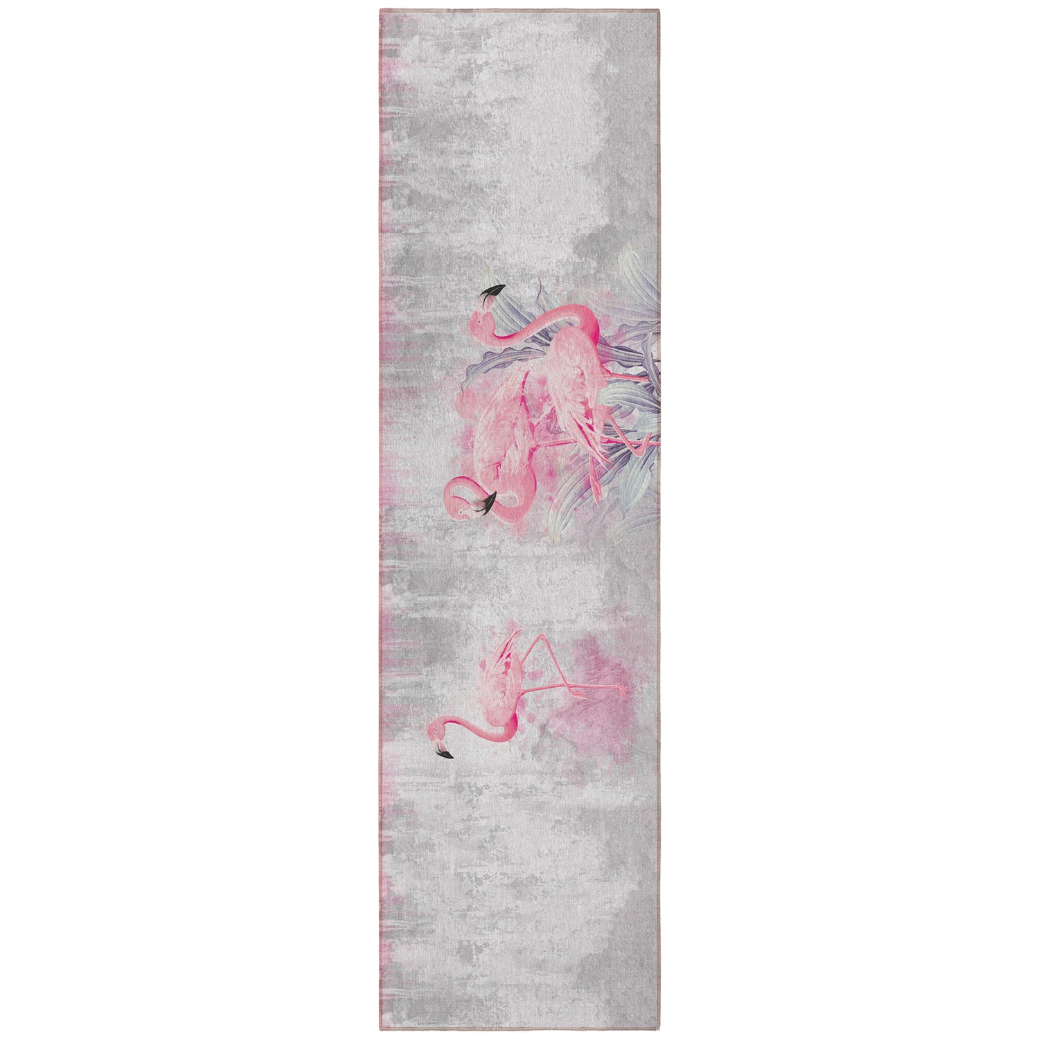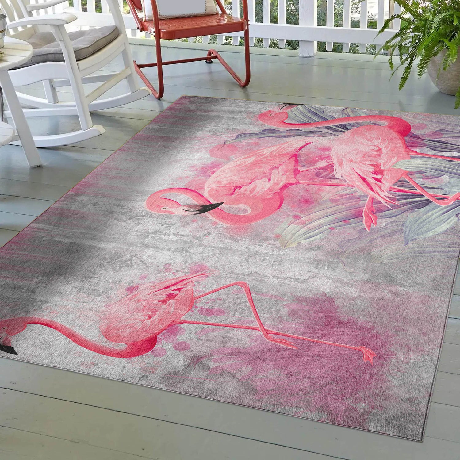 The subtle silver-gray backdrop adds a contemporary touch, letting the flamingos pop with vivid artistry. Whether you're brightening up a sunroom, coastal cottage, or patio retreat, this rug brings a playful twist to your décor while keeping things stylish and grounded.