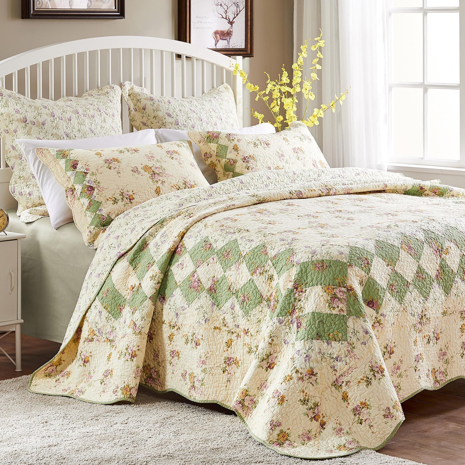 The vintage floral argyle design features charming artwork with soft hues and delicate details. The quilt is framed by and reverses to a coordinating floral design.