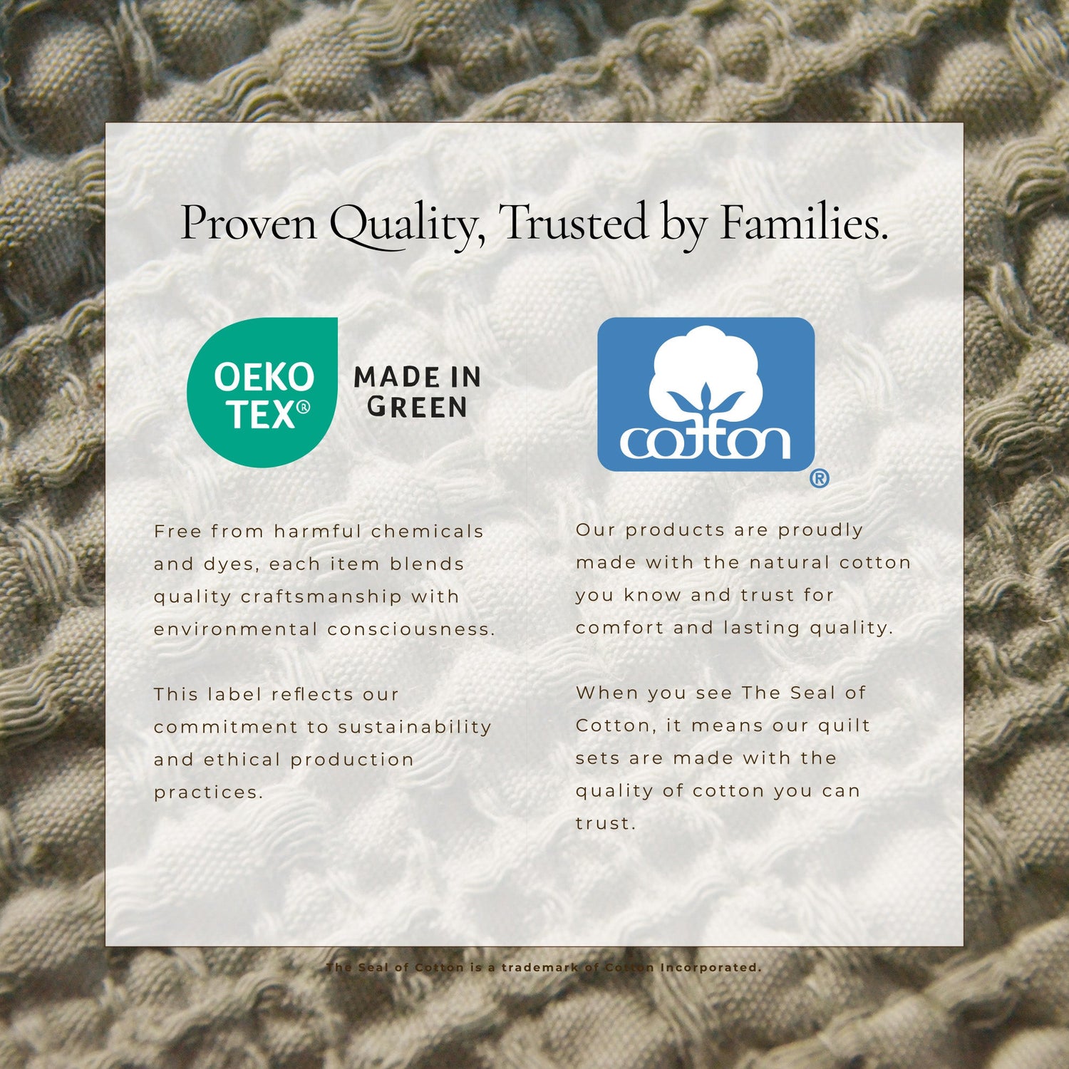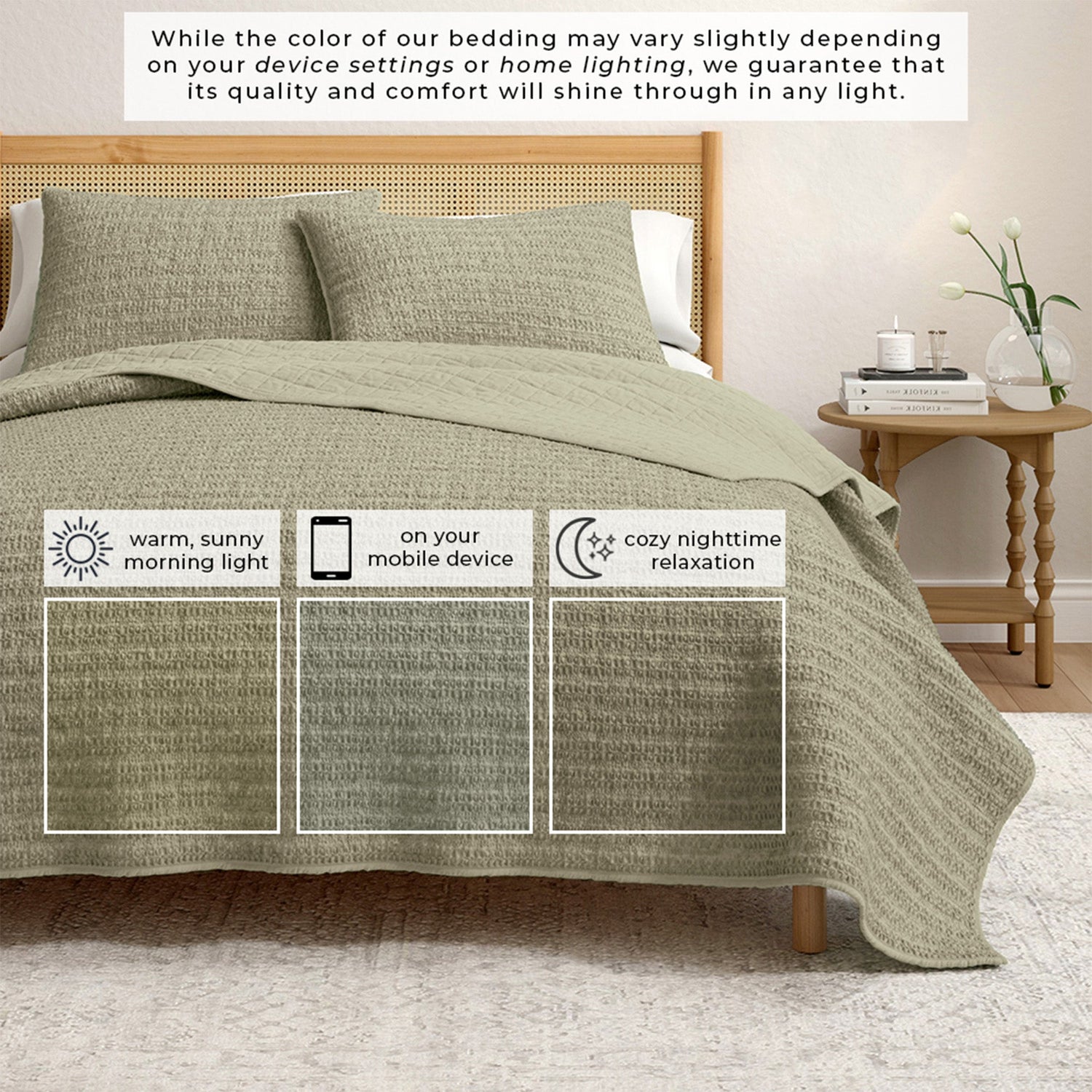 Instantly make your bedroom comfier and more inviting with this 100% cotton waffle weave quilt and sham set. We've garment washed it for extra softness, so it feels relaxed and "already loved" from the very first night. It comes in go-with-anything colors, making it super easy to mix and match with your current bedding, adding a touch of cozy style that works year-round. Plus, you can feel really good knowing this set is made without harmful chemicals and in a way that's kind to our planet.