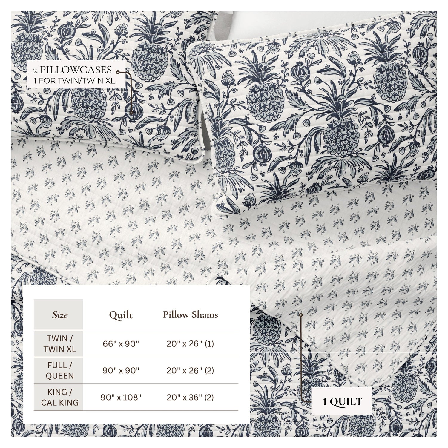 Bring a fresh aesthetic to your bedroom with our elevated pineapple-printed cotton quilt set. Featuring a charming design that blends whimsical style with modern chic, this quilt adds personality and flair to any space. The reversible pattern offers versatility, letting you switch between two stylish looks to suit your mood or decor. Crafted from natural cotton with a durable down-alternative fill, this quilt delivers the perfect balance of softness, breathability, and durability. Lightweight yet cozy, it’s ideal for year-round use—whether as a standalone layer on warmer nights or for added warmth during cooler seasons. Elevate your bedroom with a quilt that’s as stylish as it is comfortable.