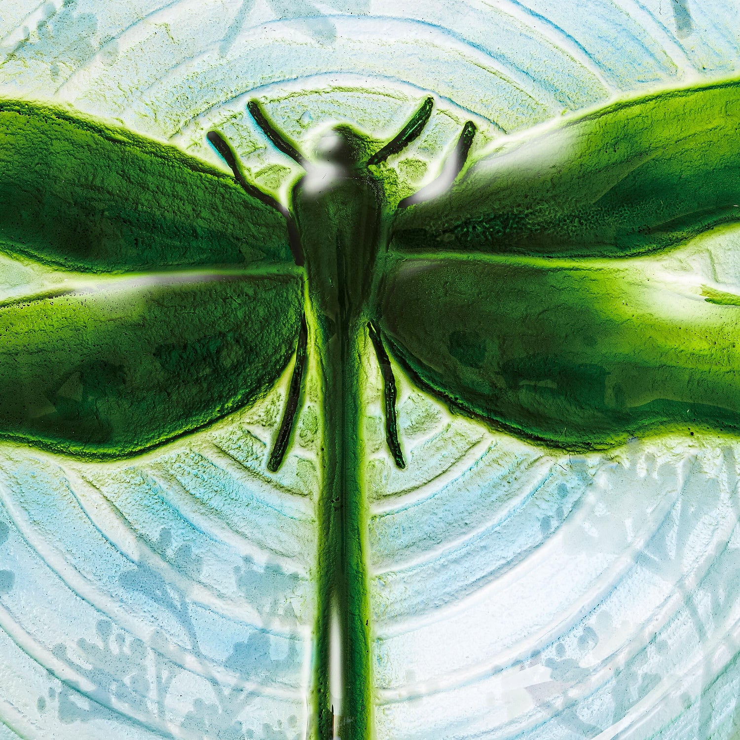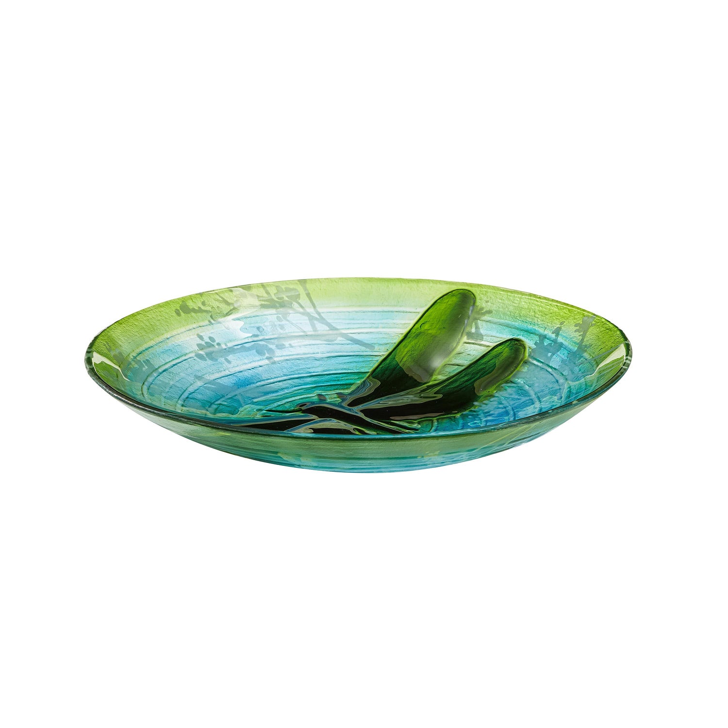 This Fluttering Dragonfly Pond Bird Bath will add color to any garden year round while attracting birds from near and far with its stunning hand-painted design. The bird bath showcases an embossed green dragonfly with leafy stems on the calming blue bowl that is enhanced with hand-painted details. Crafted from durable glass, the bowl is outdoor safe and fade-resistant to ensure it stays vibrant season after season. Measuring 18 inches in diameter, the uniquely shaped bird bath holds up to 64 ounces of liquid. Perfect for every season, this bird bath is a gorgeous addition to any garden. Stand sold separately.