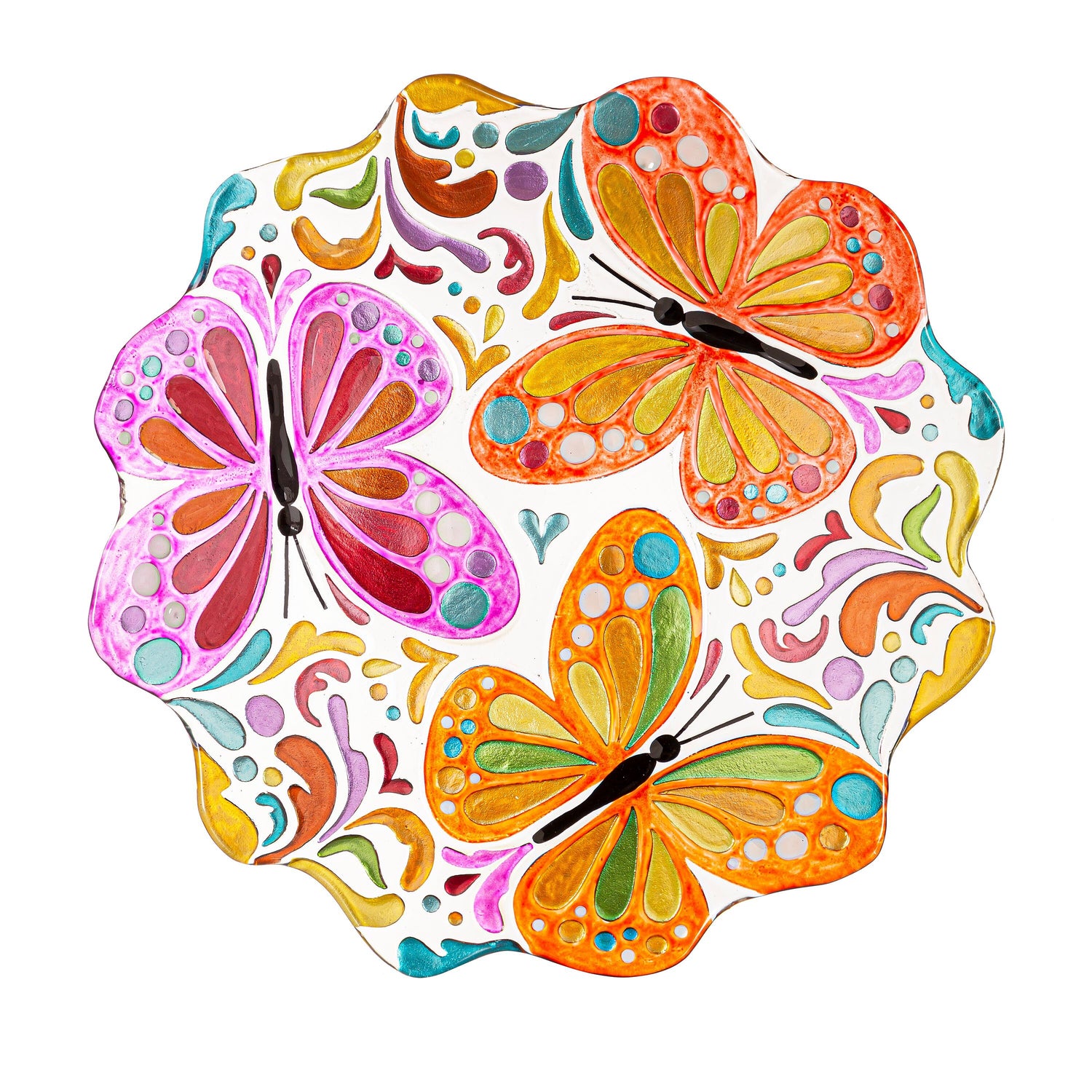 This Butterfly Sculpted Glass Birdbath Basin features a trio of butterflies with swirled details to create a beautiful basin full of color and style.