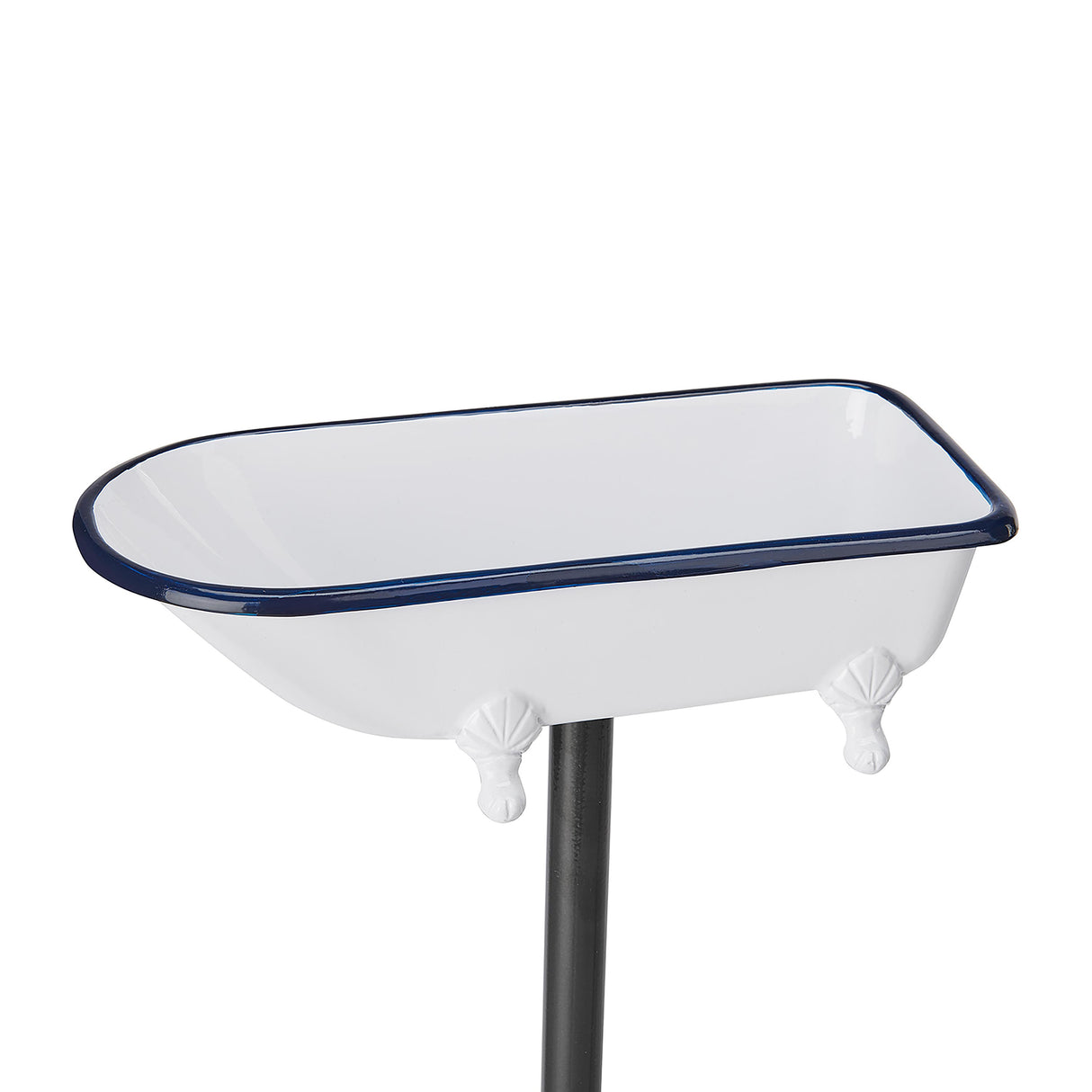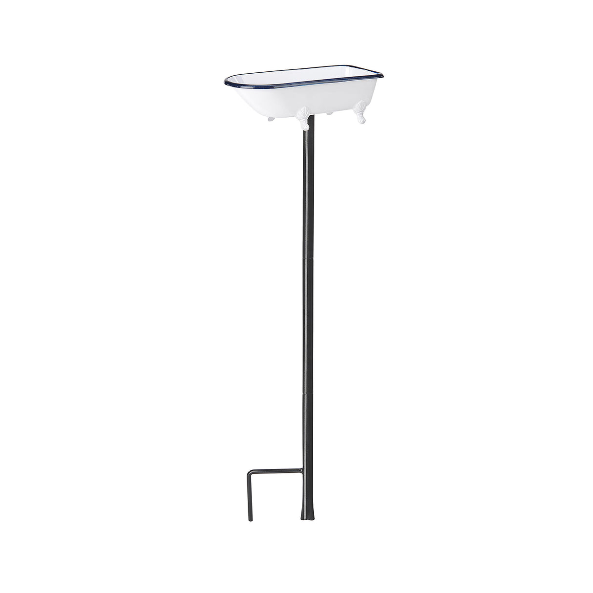 A staked, powder-coated steel garden pole serves as a sturdy support for the basin. Birdbath is made of pure brass, with a hand-applied white finish. Tub has solid brass feet for vintage claw-foot tub appeal.