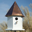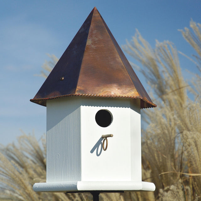 Specially designed to delight bluebirds, this unique, hexagonal Copper Songbird Deluxe birdhouse features a white exterior with a handsome copper roof and 1-inch entry hole. Made in USA.