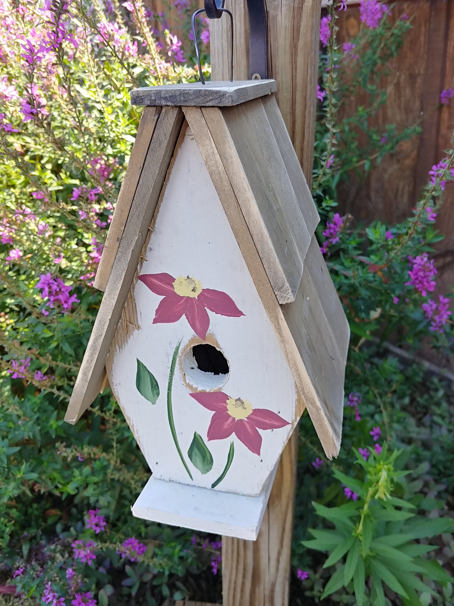 Hand crafted bird house made in the heart of Eastern PA. Made from reclaimed and recycled barnwood. This A Frame house is decorated with hand painted flowers with a roof of reclaimed cedar shingles.