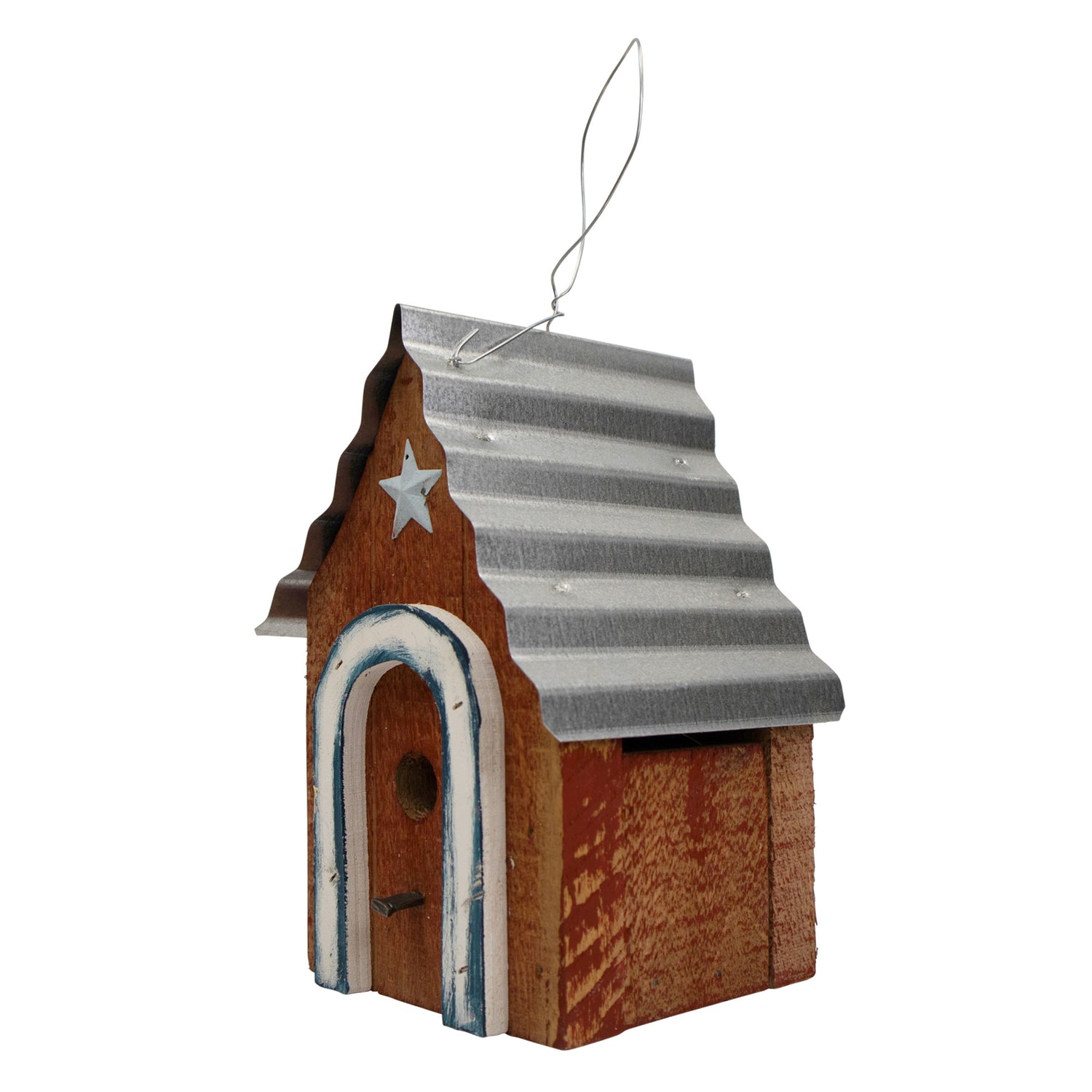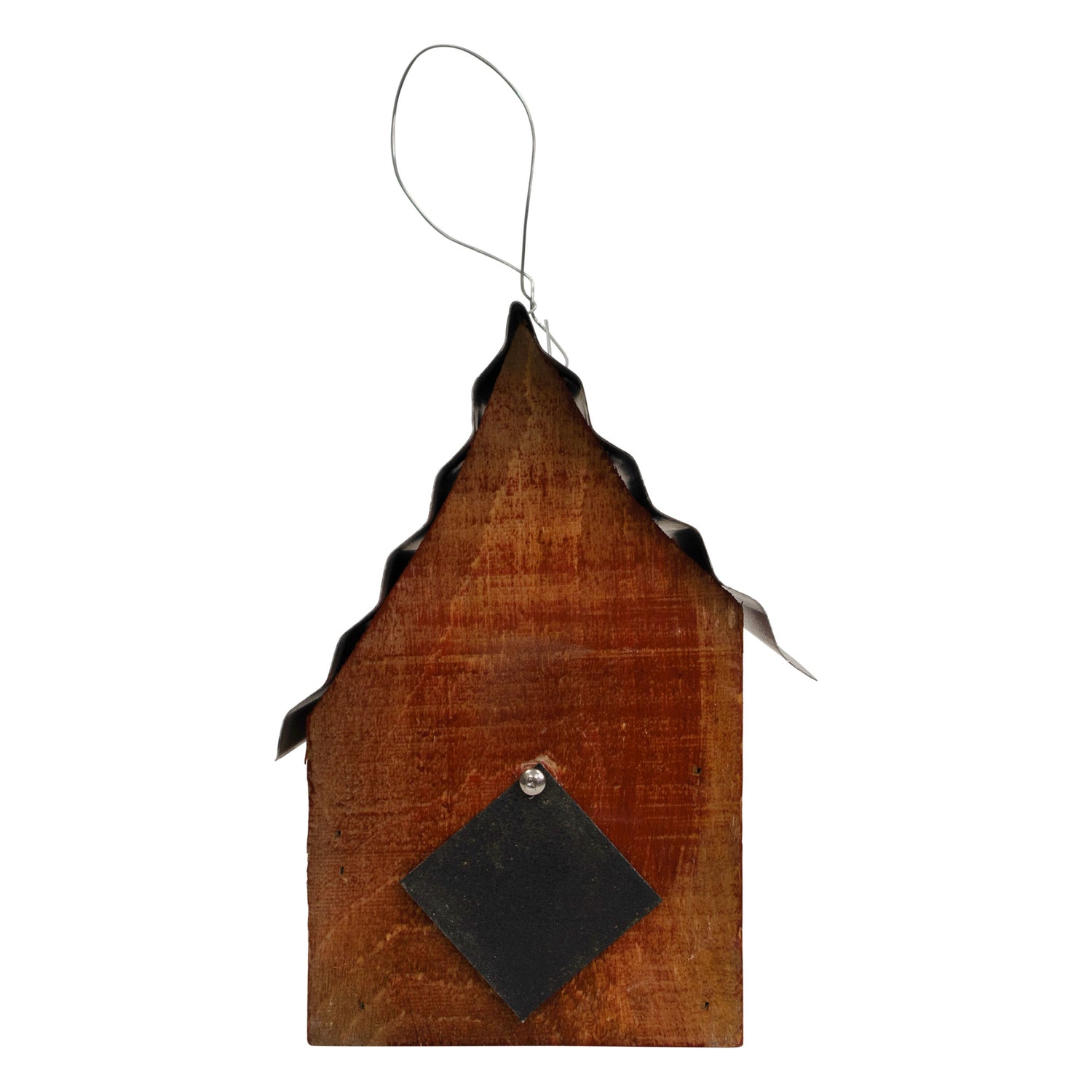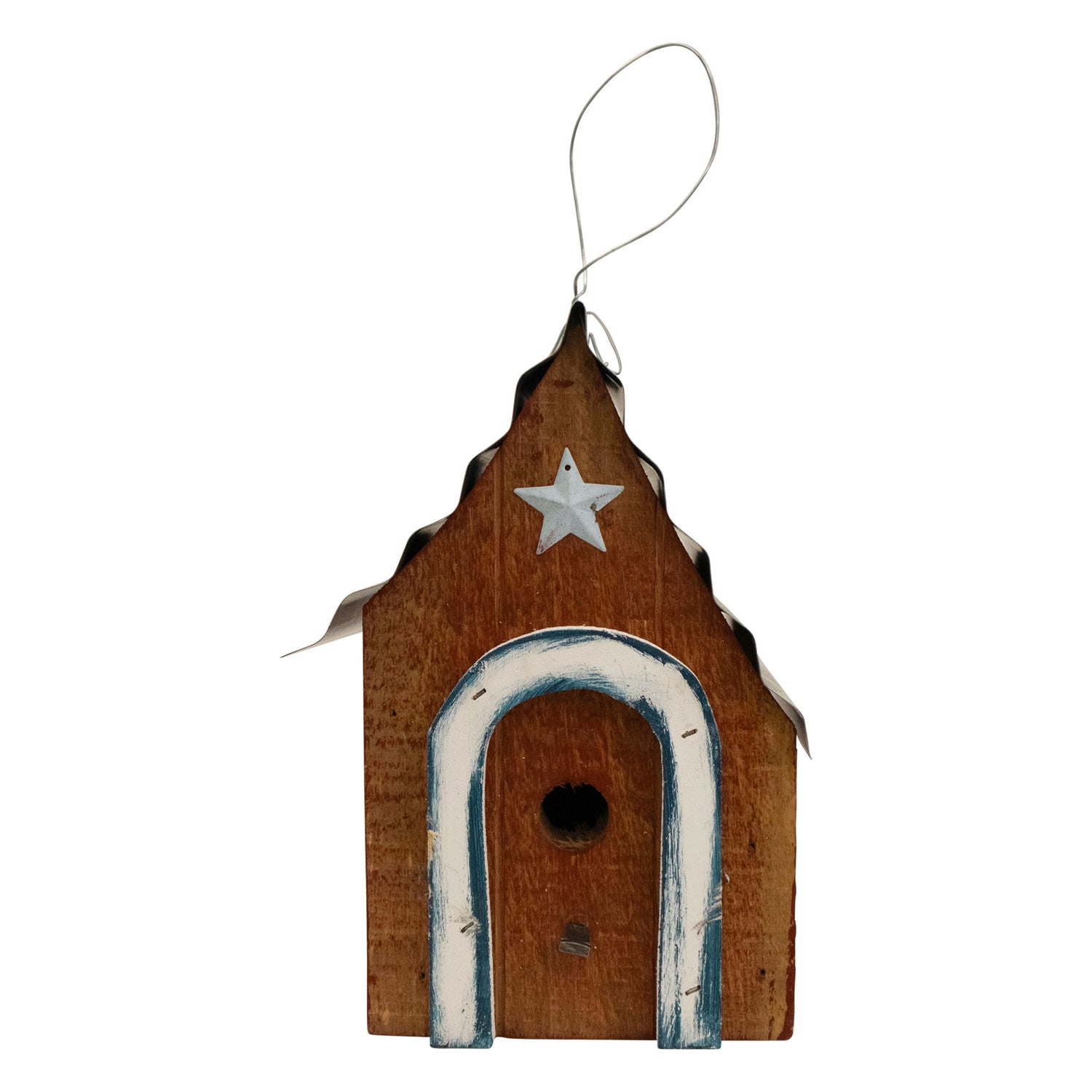 Constructed from pine wood, this birdhouse has cleanout options, drainage, and ventilation. The metal hanger enables you to place it anywhere in your yard or garden. Handcrafted, no two pieces are alike.