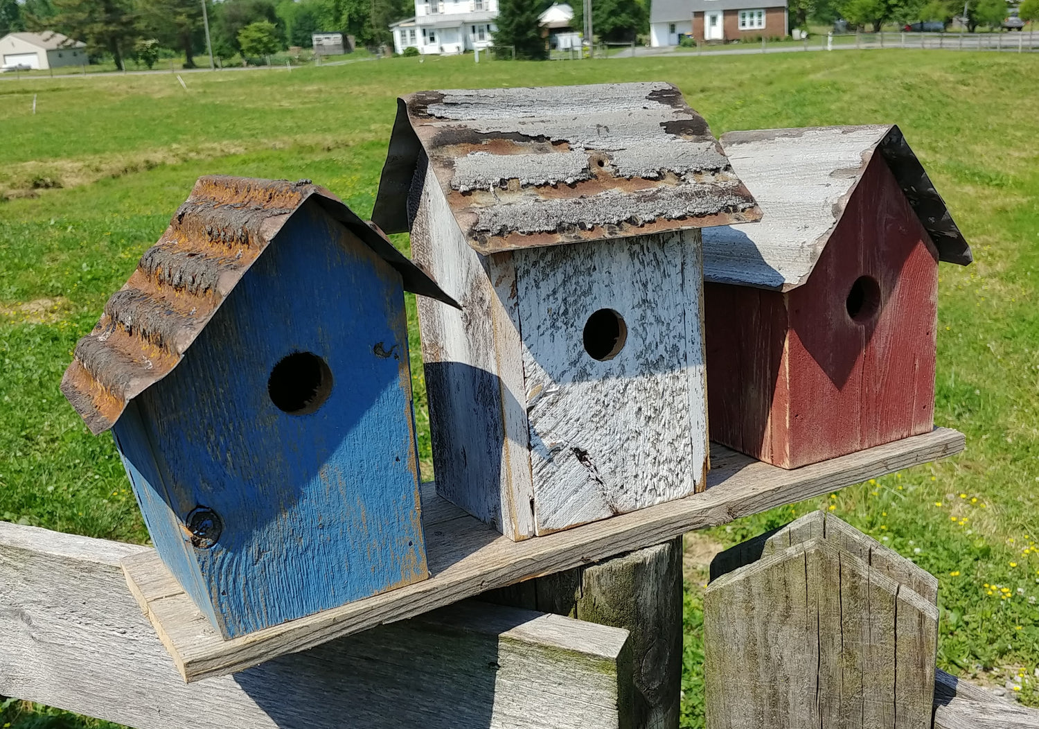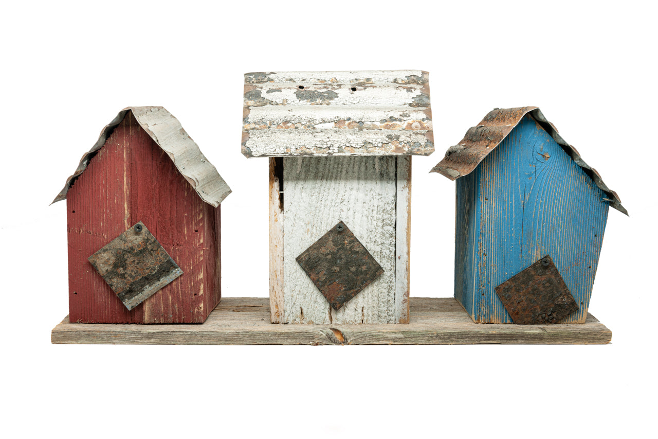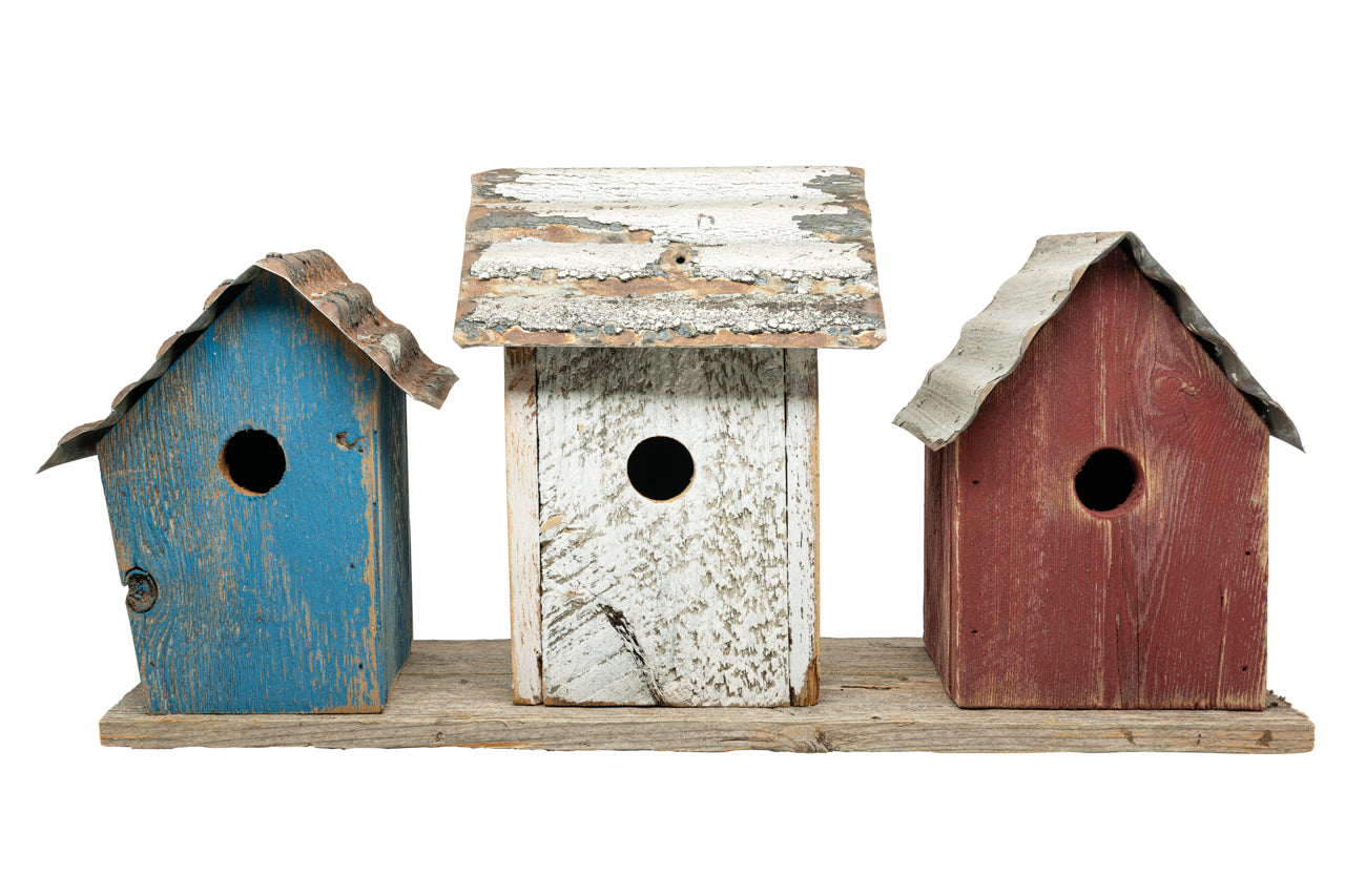 Bring timeless Americana charm to your garden with the Union Trio Rustic Birdhouse. This handcrafted decorative piece features three uniquely styled houses in weathered red, white, and blue, each with its own distressed finish and corrugated metal roof. Designed to evoke nostalgic farmhouse style, this triple birdhouse is perfect for porches, fences, or patios.