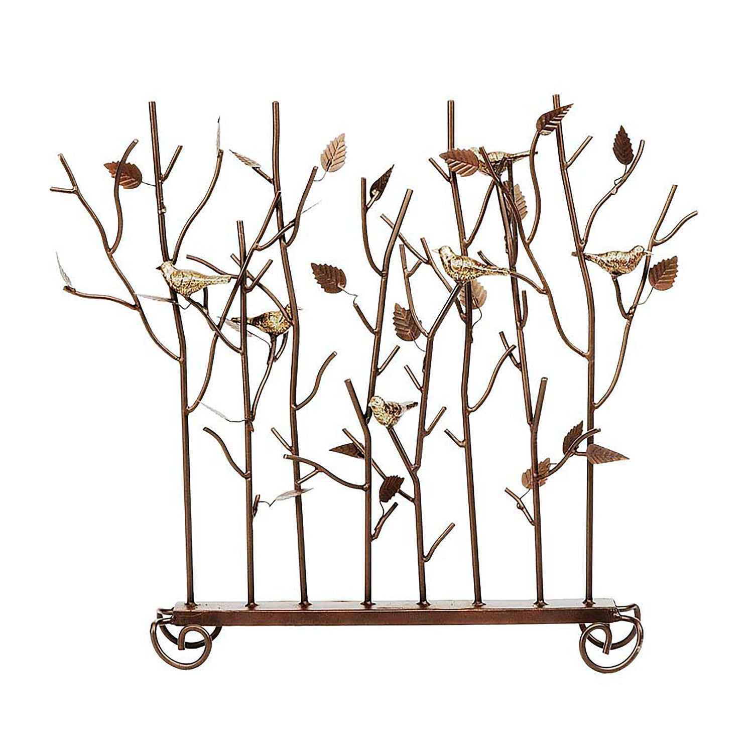 This unique fireplace screen ensures your hearth remains the focal point of the room even during warmer seasons. This delightful birds fireplace screen brings the outdoors into your home with a rustic design featuring a row of leafy branches with little gold-tone birds perched on them. Constructed of wrought iron in a powder-coated bronze finish and accented with gold detailing.