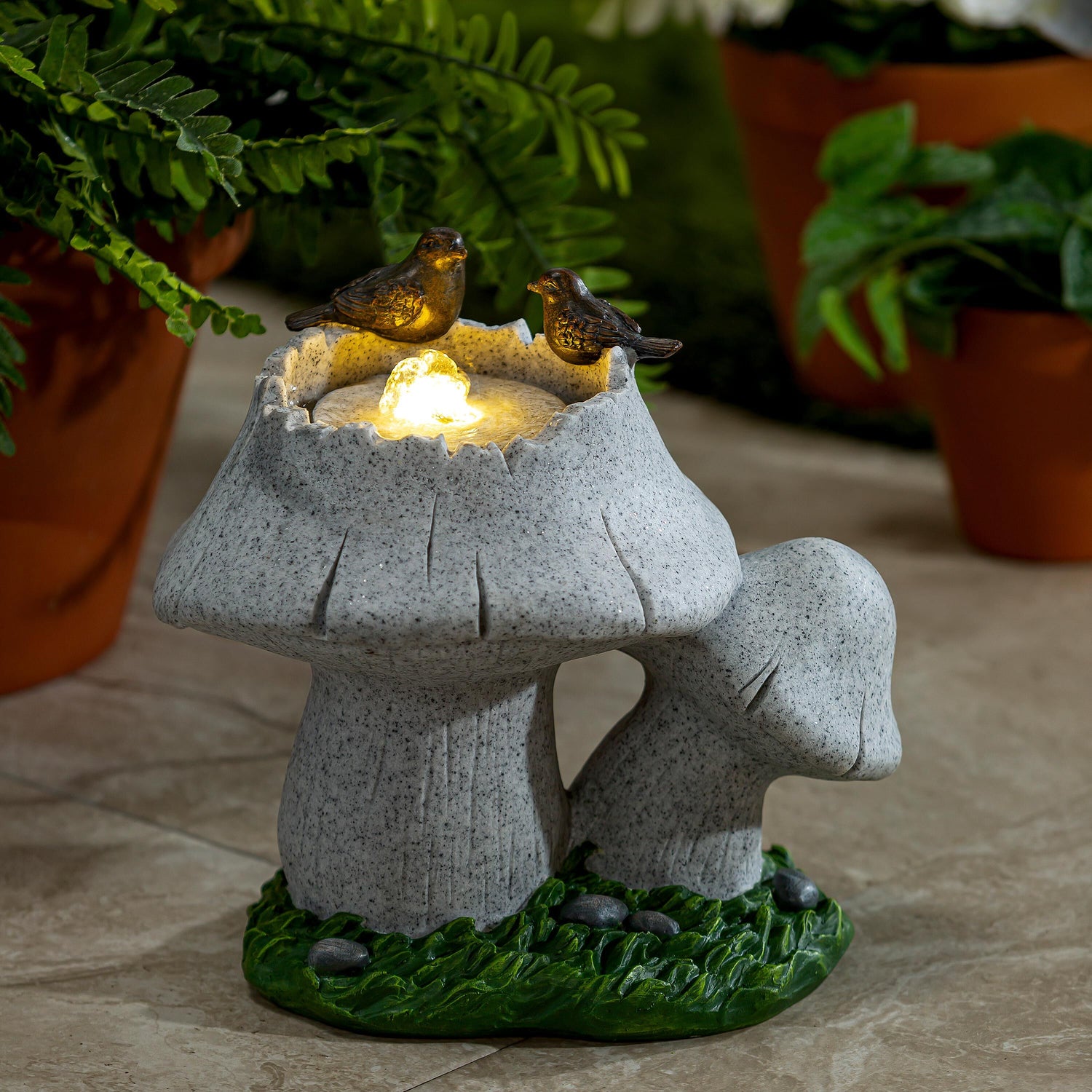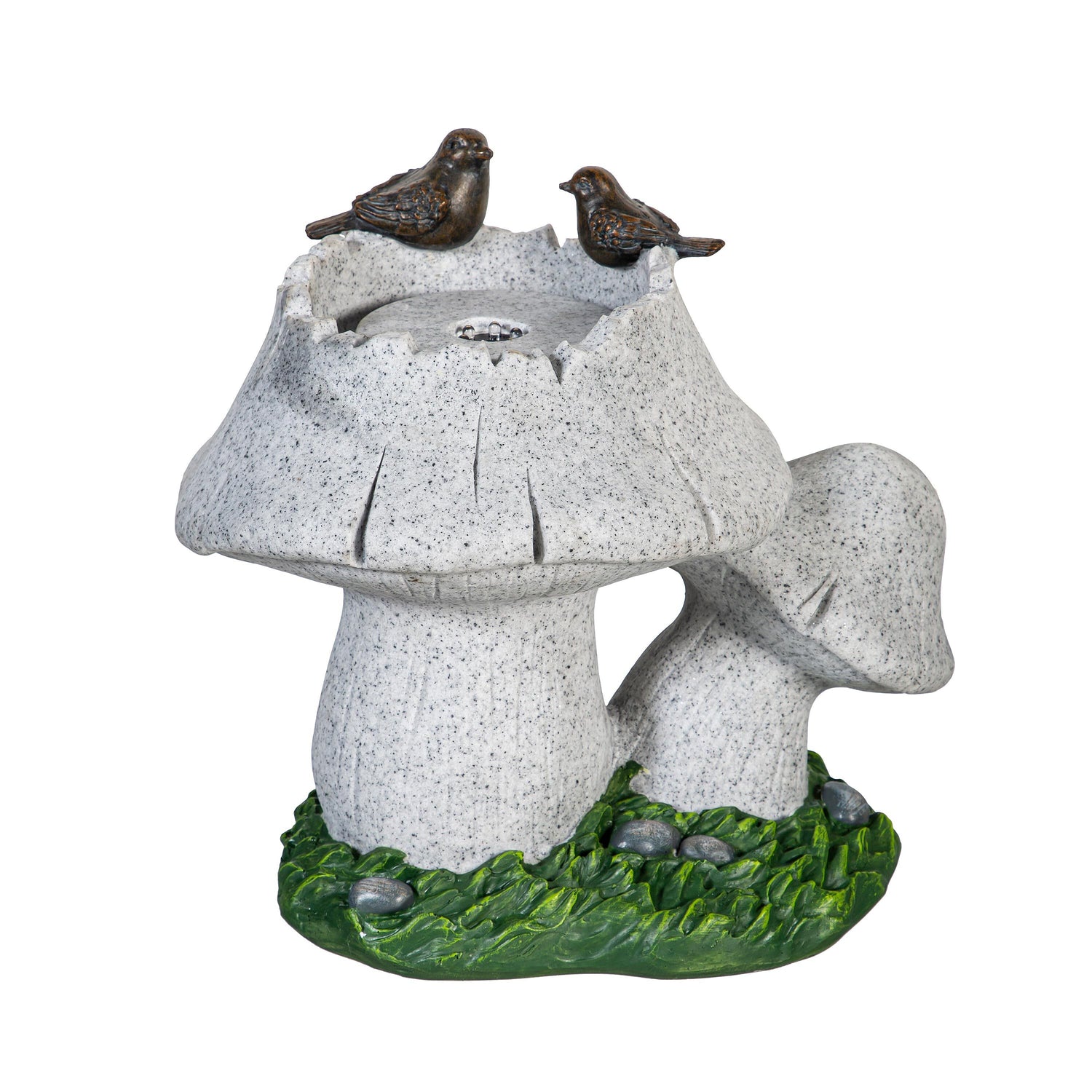 Let the trickling sound of water from this fountain create a welcoming and calming atmosphere wherever needed. With a mushroom design and adorable birds perch on the side, this fountain will transform any space into an oasis. A steady stream of water cascades over this fountain with a design that is sure to delight. Crafted from a weather-resistant materials, this fountain is best used indoors..