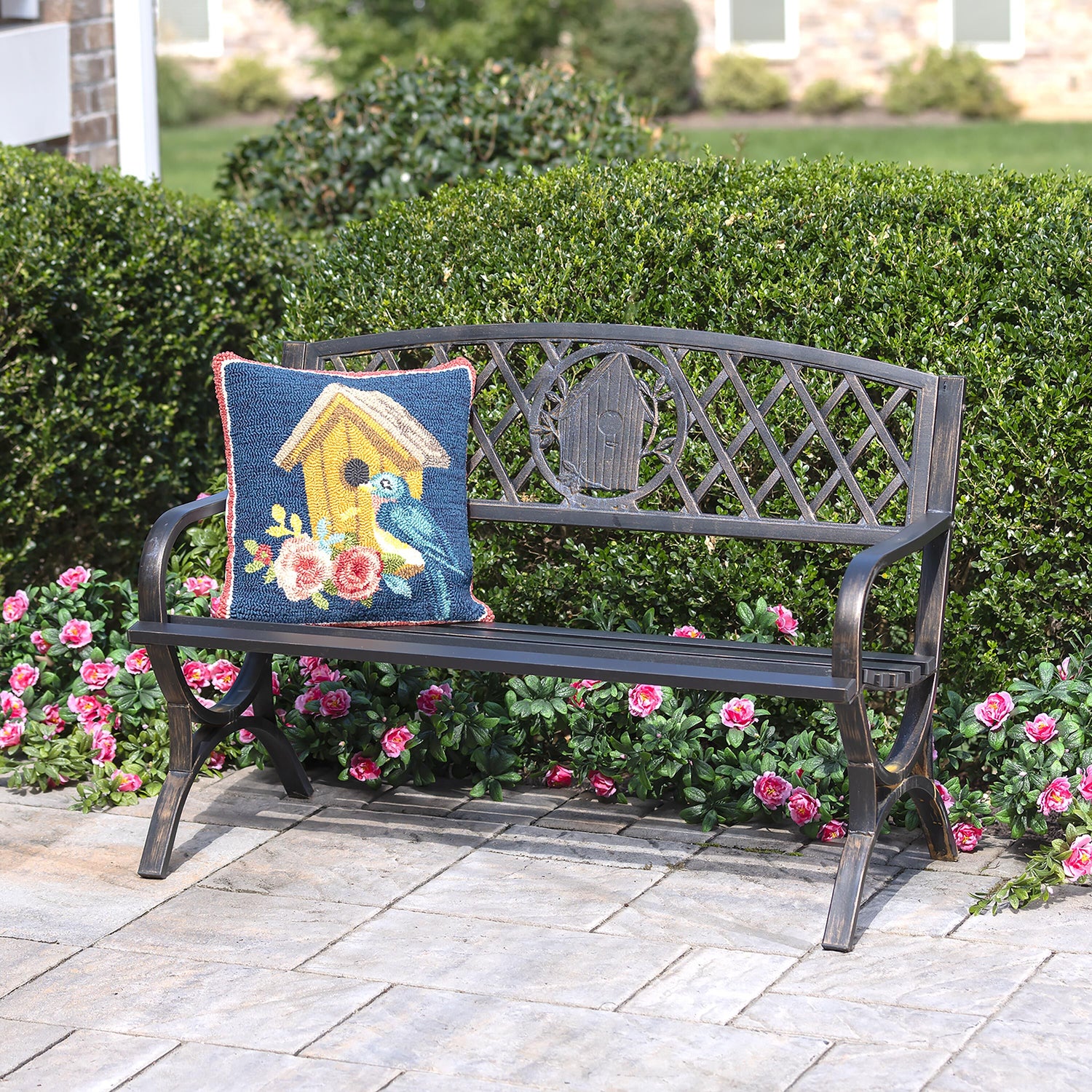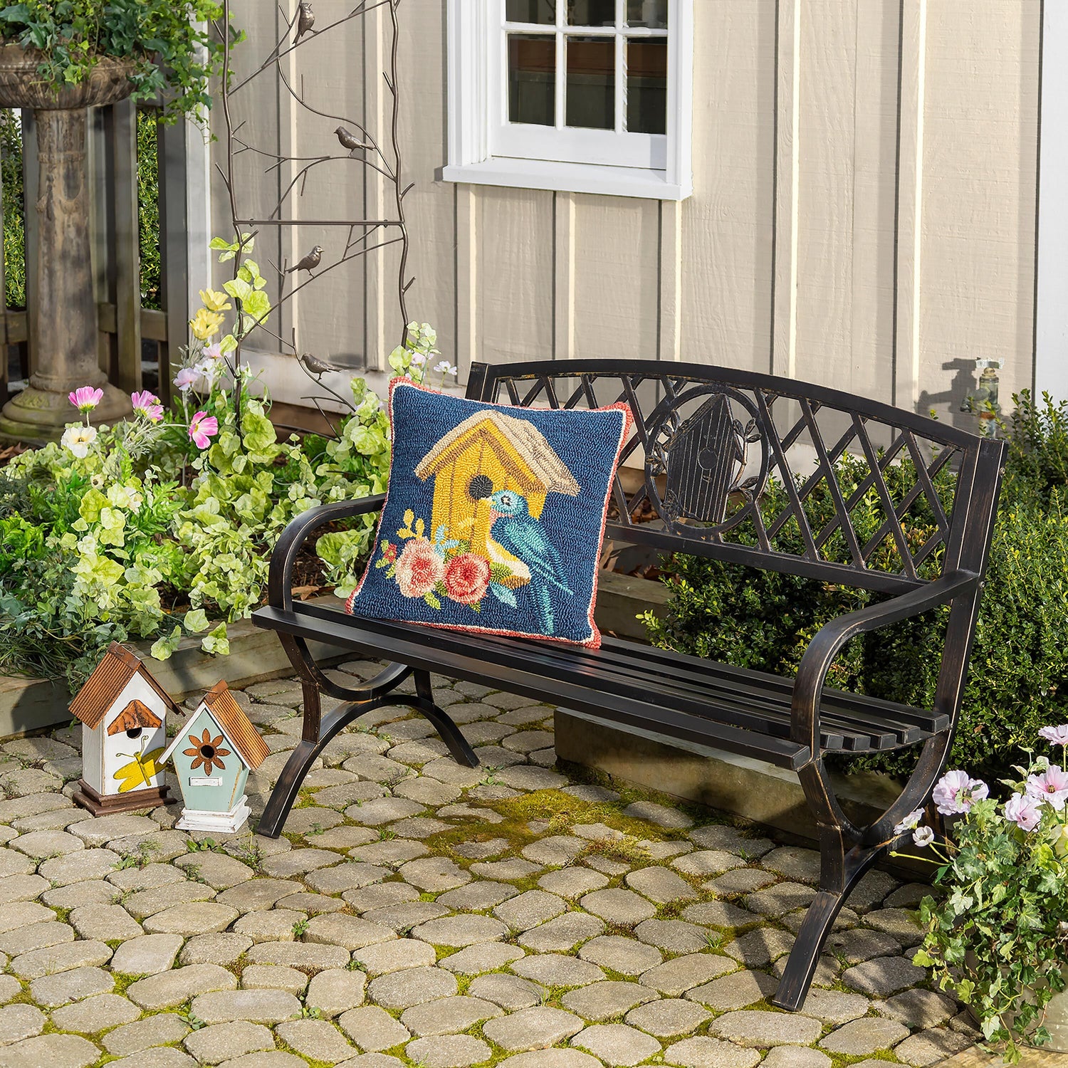 Indoor/Outdoor Birdhouse Hooked Polypropylene Throw Pillow