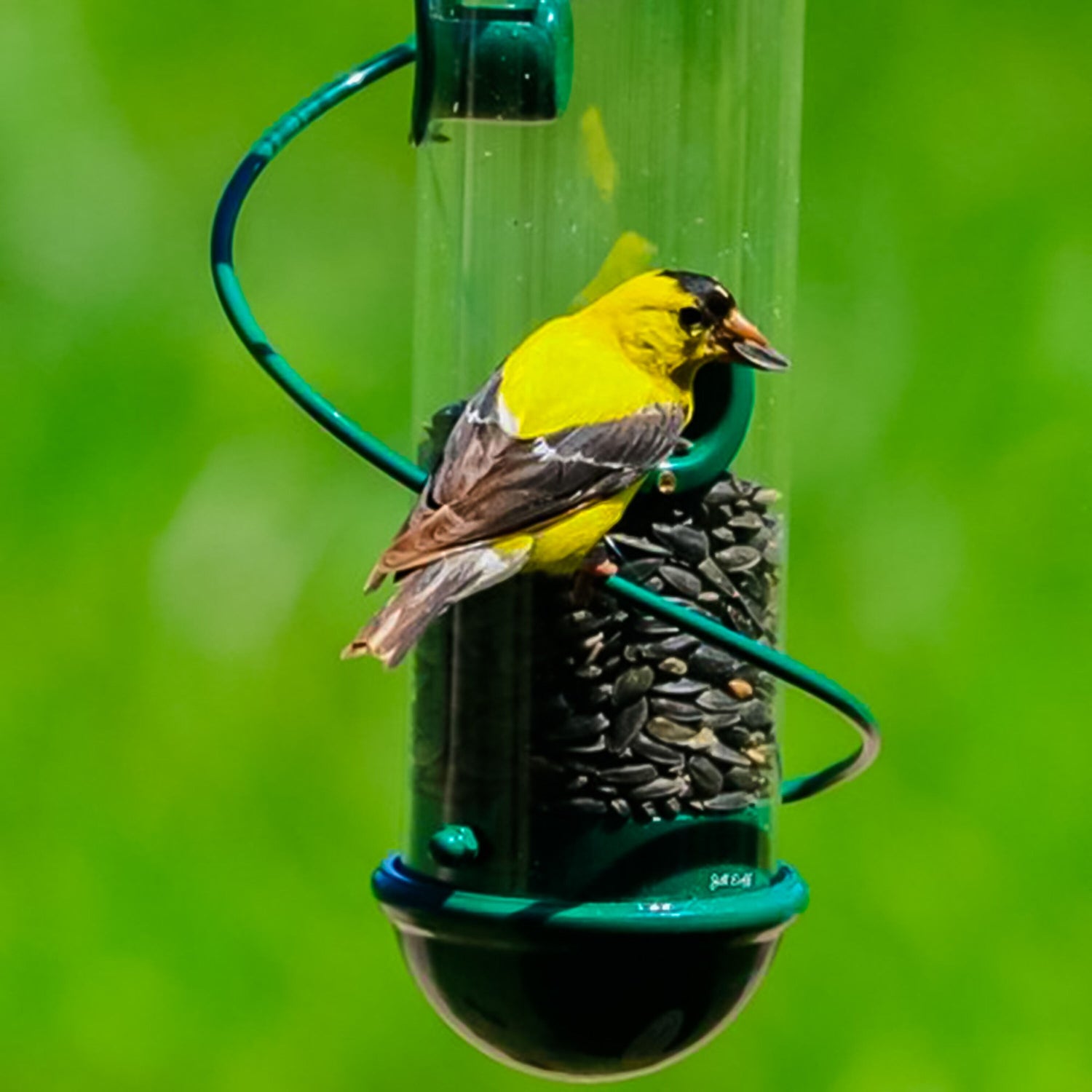 Green-colored aluminum and stainless steel parts ensure long life and a squirrel-proof patented locking lid keeps those pesky varmints out. Both ends of the tube unscrew for easy cleaning and filling, and the top cap is attached to the hanging wire so you won't misplace it. Holds up to 2½ quarts of seed (1½ pounds).