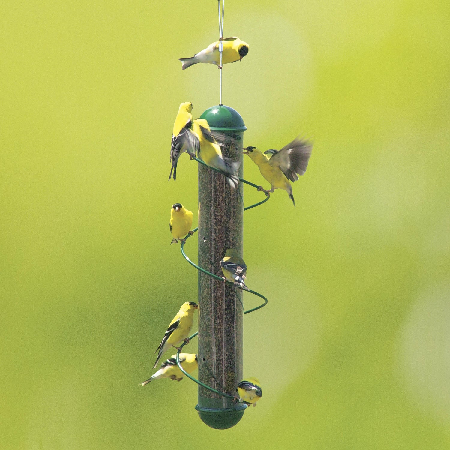 Birds love to run up and down this Spiral Finch Bird Feeder instead of flying to another perch. This unique feeder features a clear plastic seed tube with multiple feeding ports surrounded by a metal spiral that winds around providing endless perching possibilities.