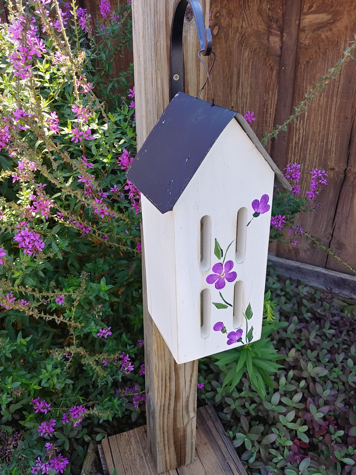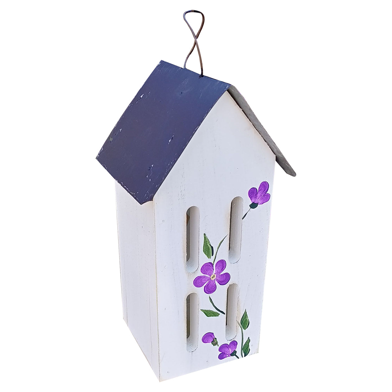 Invite delicate pollinators into your garden with this hand-painted butterfly house, designed to offer cozy shelter and charming style. Featuring a slender wooden silhouette, deep purple roof, and vibrant hand-painted purple blooms, this decorative piece is both functional and beautiful.