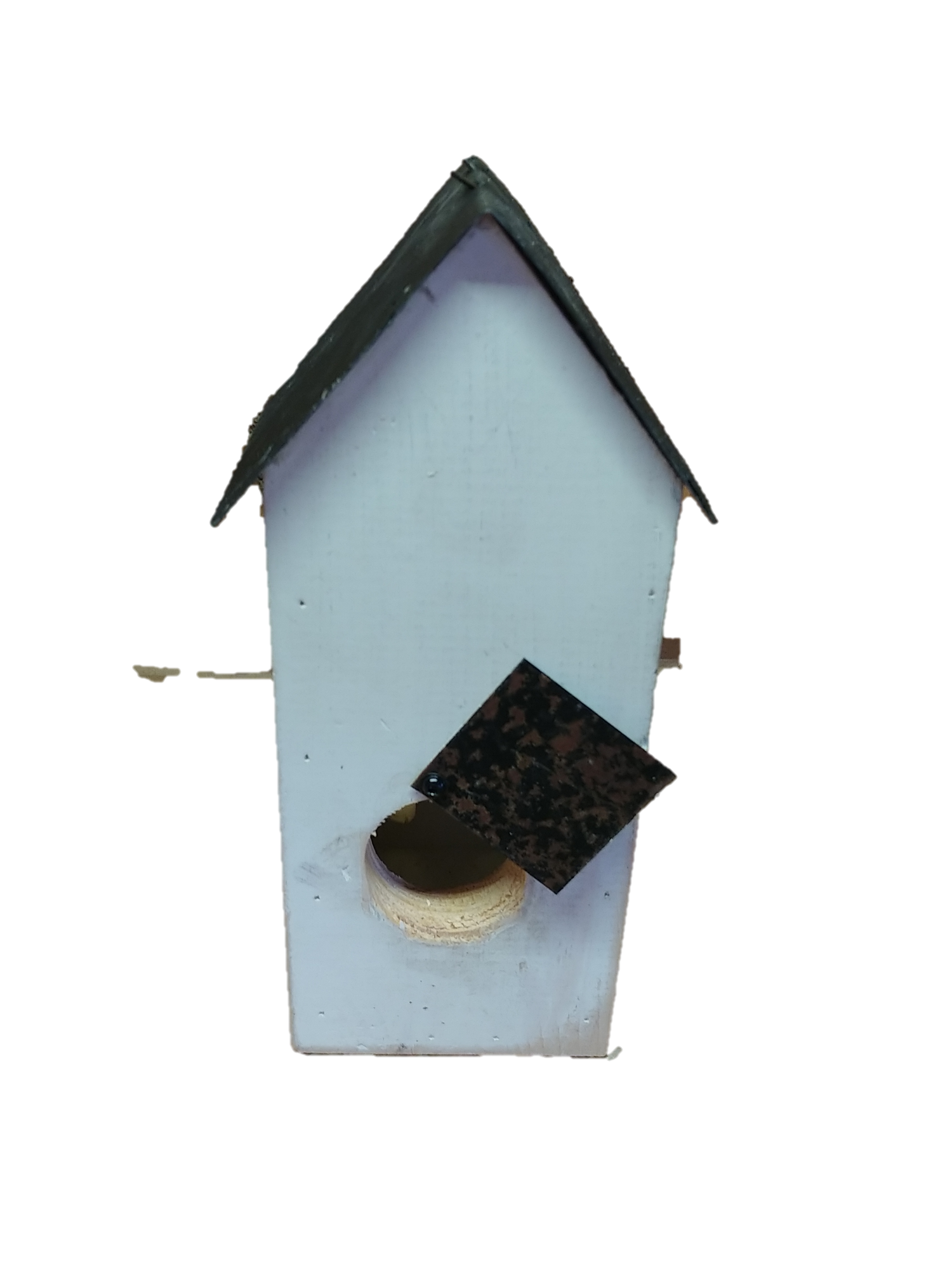 • Weathered metal roof and twisted wire loop make for easy outdoor display.