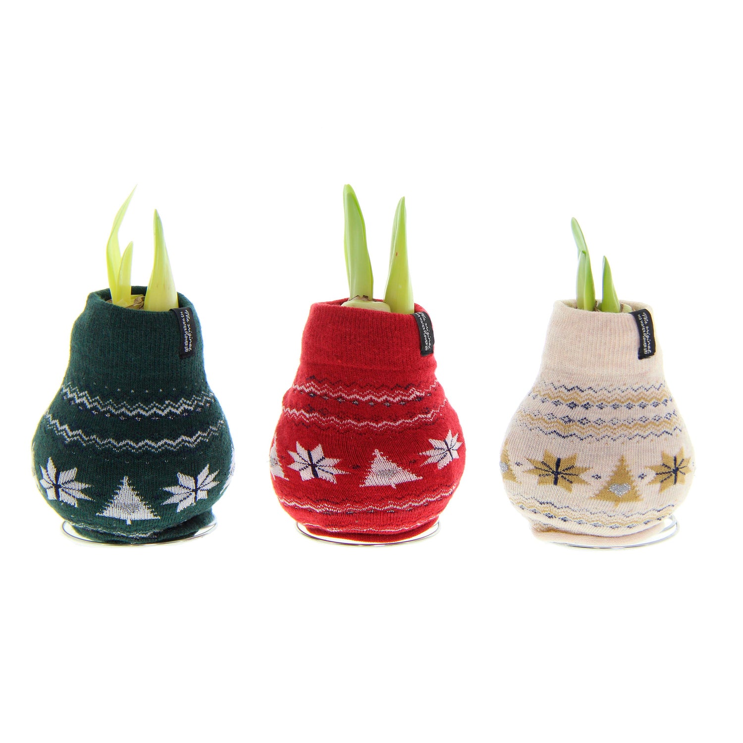 Plus, the bulb looks pretty even before it blooms thanks to the fun design and texture of the “sweater.” Place it on any flat surface for beautiful display all on its own or decorate with moss, greenery and other seasonal accents for another look.
