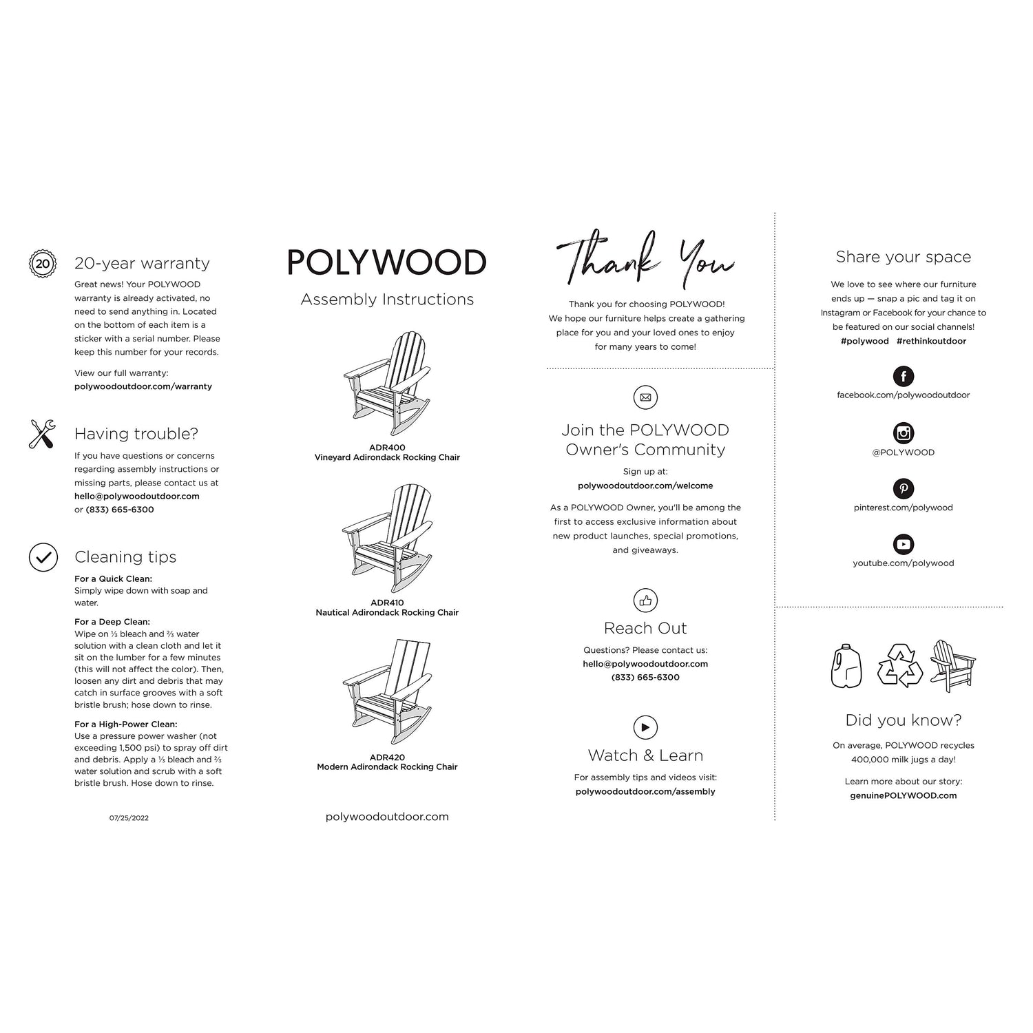POLYWOOD is built to last a lifetime and designed for life outdoors. Perfect for deck, patio, porch, poolside, beach house, cabin and more. Any climate, any season, it's forever furniture. Consciously crafted in the USA. Some assembly required.