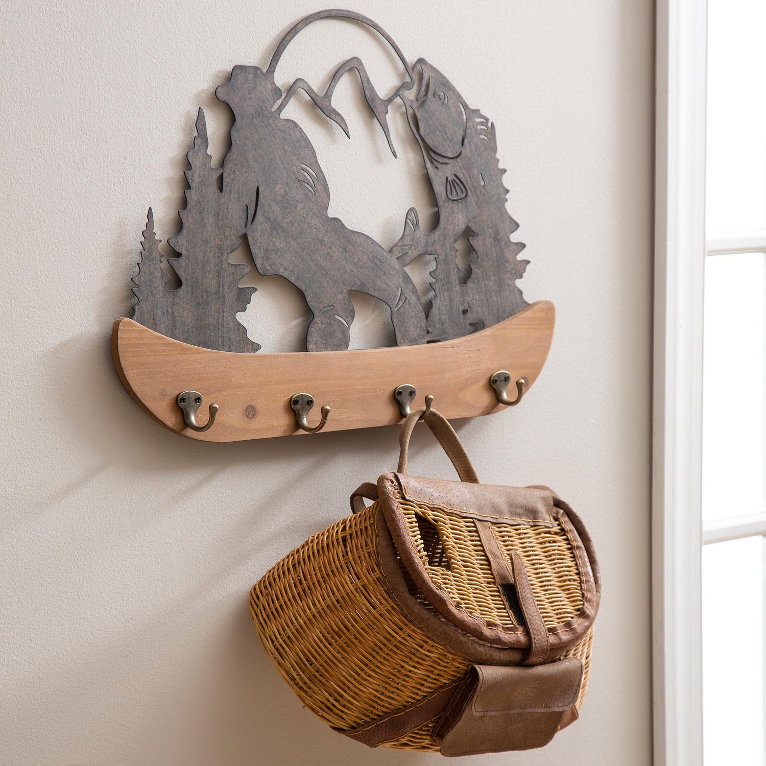 These wall hooks are elevated with a rustic lodge feel with the natural wooden panel and galvanized metal cutout scene. Picturing a man gone fishing in the mountains, this wall décor adds function and nature-inspired style to any space. The distressed finish of the metal scene adds to the rustic appeal of this design. With 4 hooks perfect for hanging backpacks, purses, keys, and more, this wall decor offers both function and style. Mount to the wall by the keyhole anchors for a secure display. It's ideal for a lodge aesthetic or cabin in the woods.