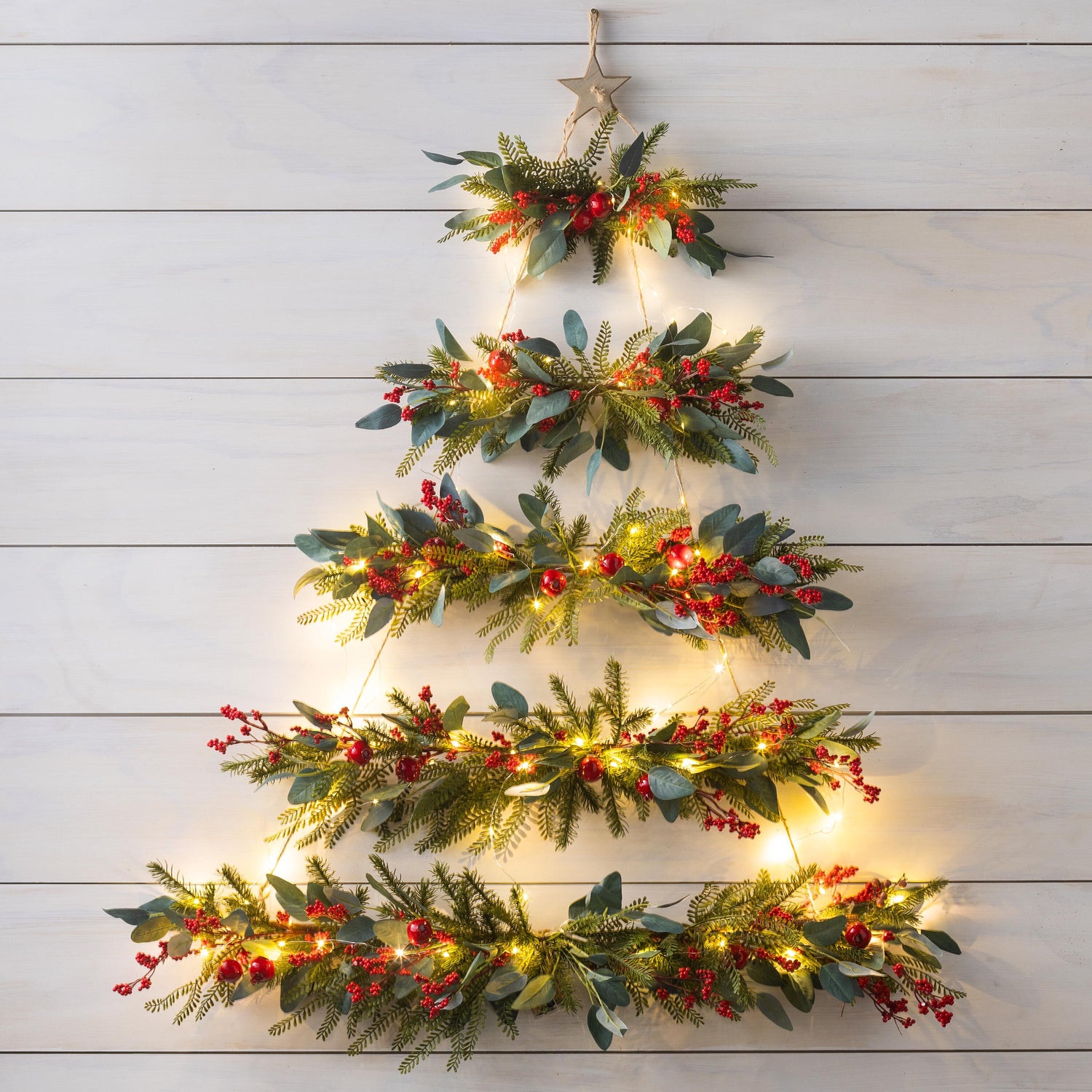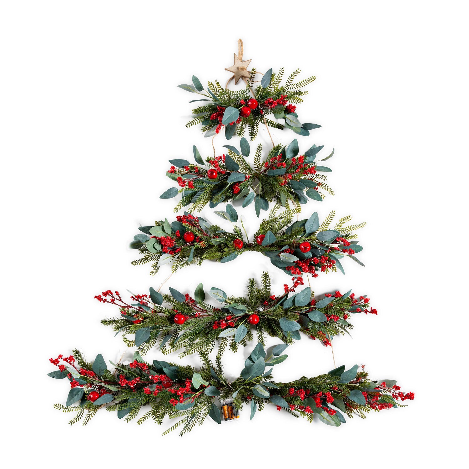 Exquisitely crafted with five boughs of lush greenery, eucalyptus, red berries and lights all capped off with a wooden star topper. Just pull it out of the box and hang anywhere indoors or under a covered area that needs a little Christmas spirit.