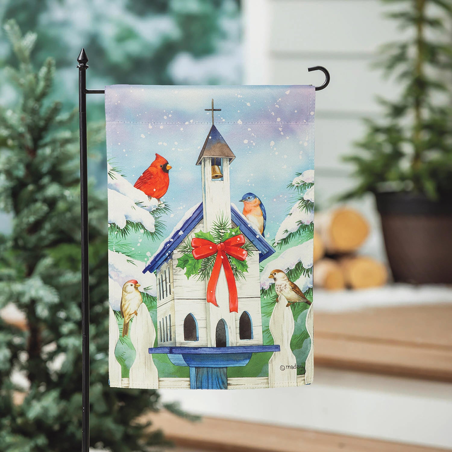 Greet family and loved ones this holiday season with this Christmas Bird House Suede Garden Flag. Featuring a beautiful winter scene, this flag will make sure everyone knows what season it is. Bright colors and a unique design ensure this flag will be the center of attention. Artwork is heat transferred onto the sun-blocking material so that it is easily viewed from both sides. The weatherproof poly-suede will not fray or fade with continued outdoor use. This flag features a sleeve for use with any standard flagpole or stand, sold separately.
