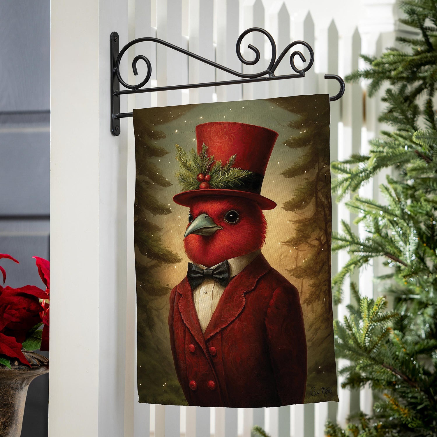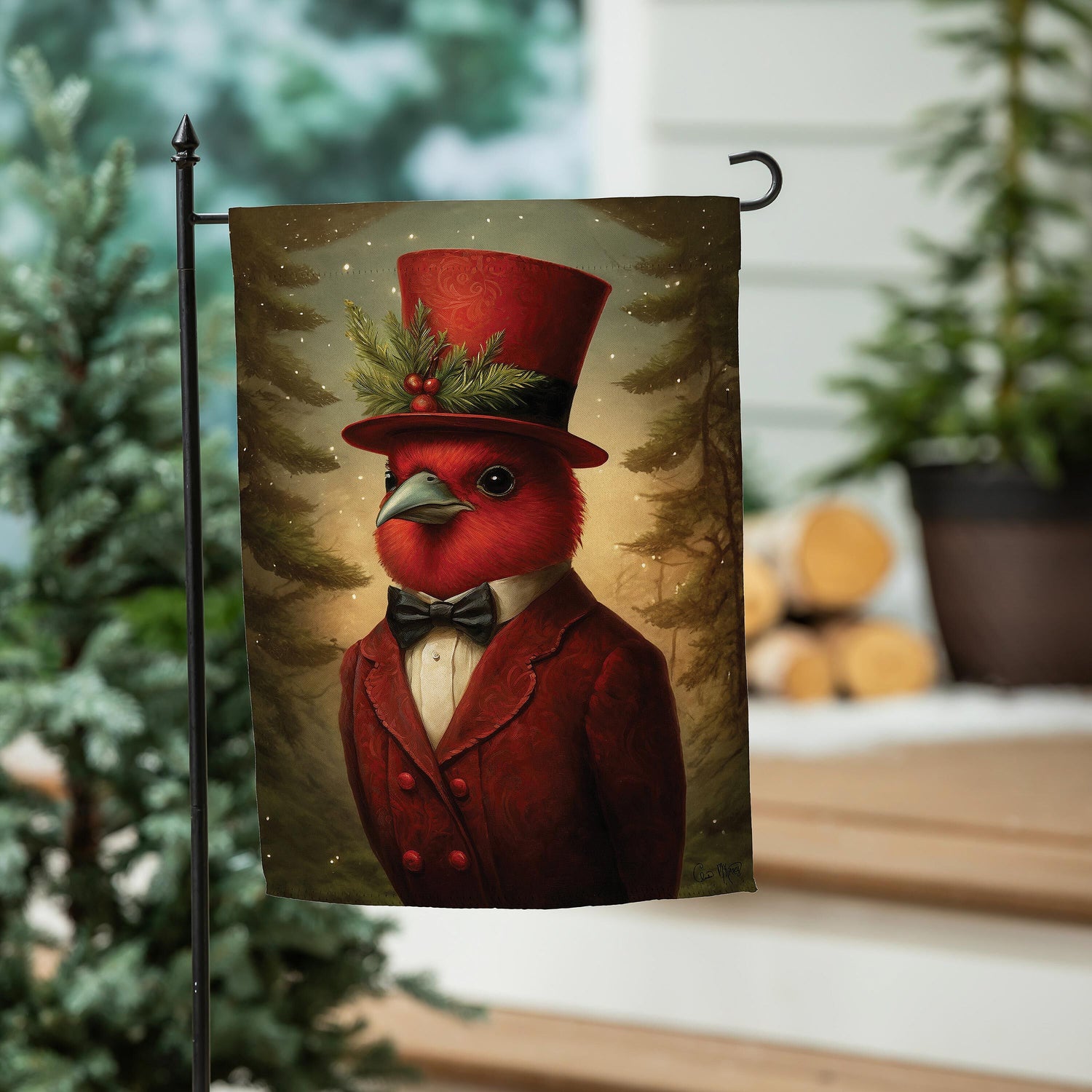 Add a touch of vintage holiday charm to your garden with this Festive Cardinal Gentleman Garden Flag.Featuring a beautifully illustrated cardinal dressed in an elegant red suit and top hat adorned with holly and evergreen accents, this design blends classic Christmas style with whimsical character. Set against a softly lit winter forest backdrop, the refined artwork creates a warm and inviting seasonal statement for your outdoor décor.Perfect for welcoming guests throughout the holiday season, this decorative flag brings personality and festive cheer to gardens, walkways, porches, and entryways.