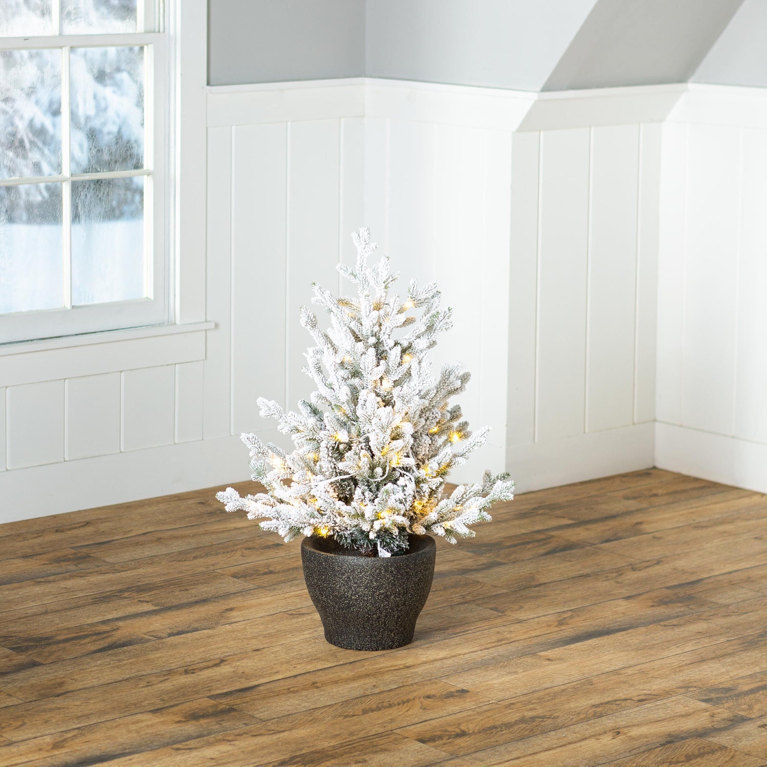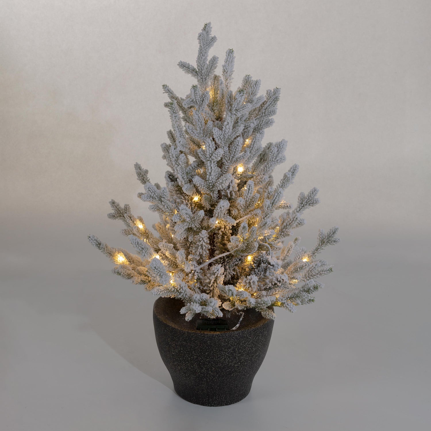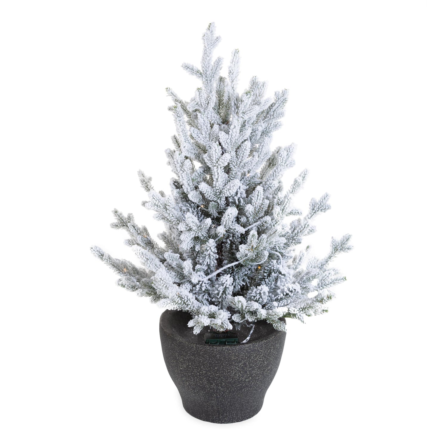 Our amazing Flocked Roanoke Spruce Potted Tree features all the best qualities of a snowy fresh-cut tree without the mess, shedding or care and comes pre-lit with warm white LED lights for a stunning and elegant accent.