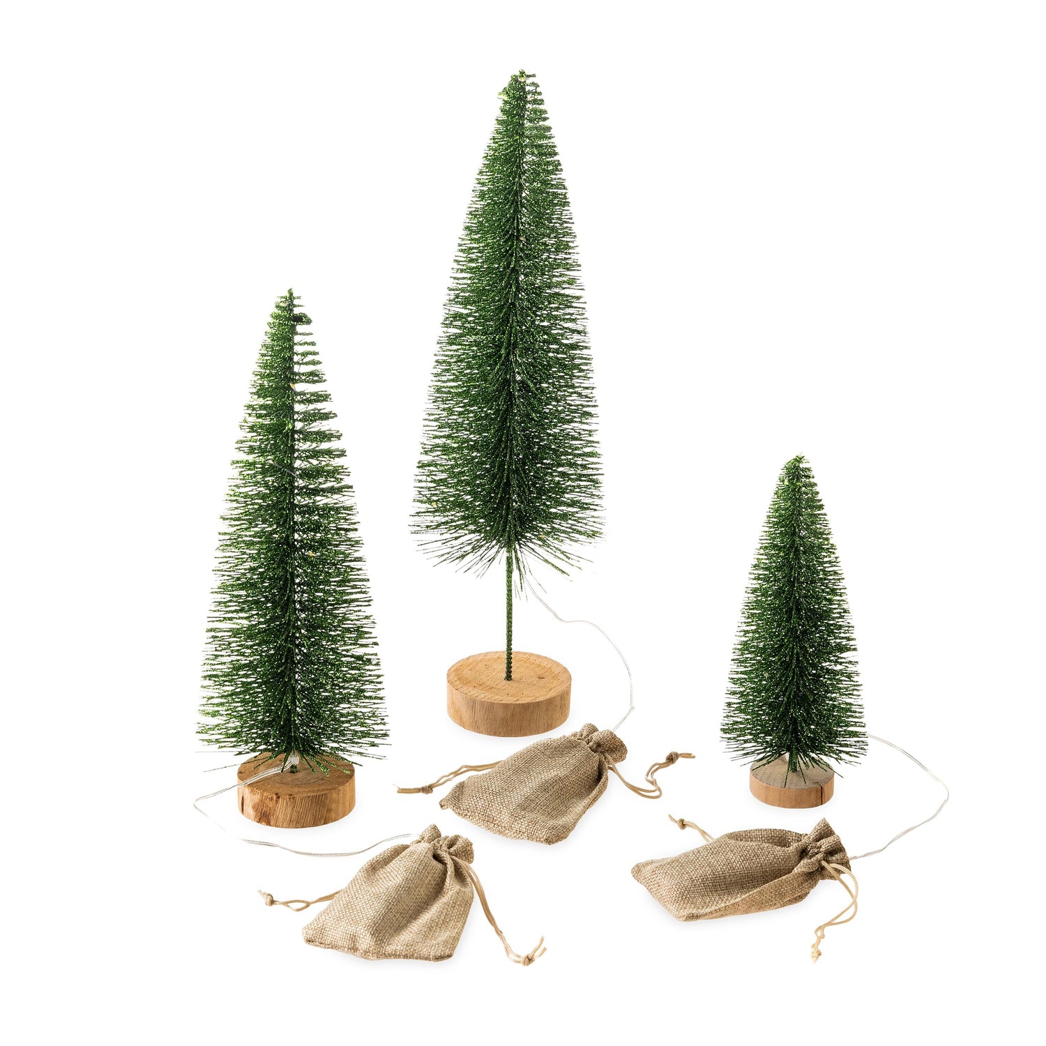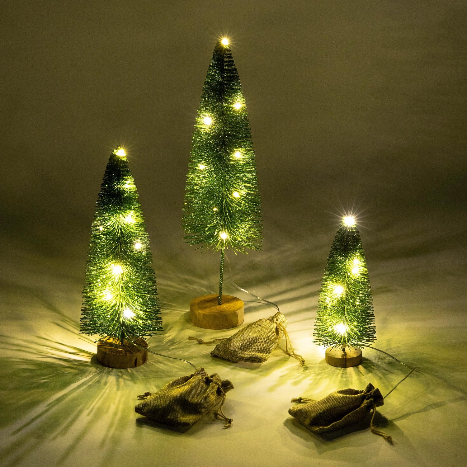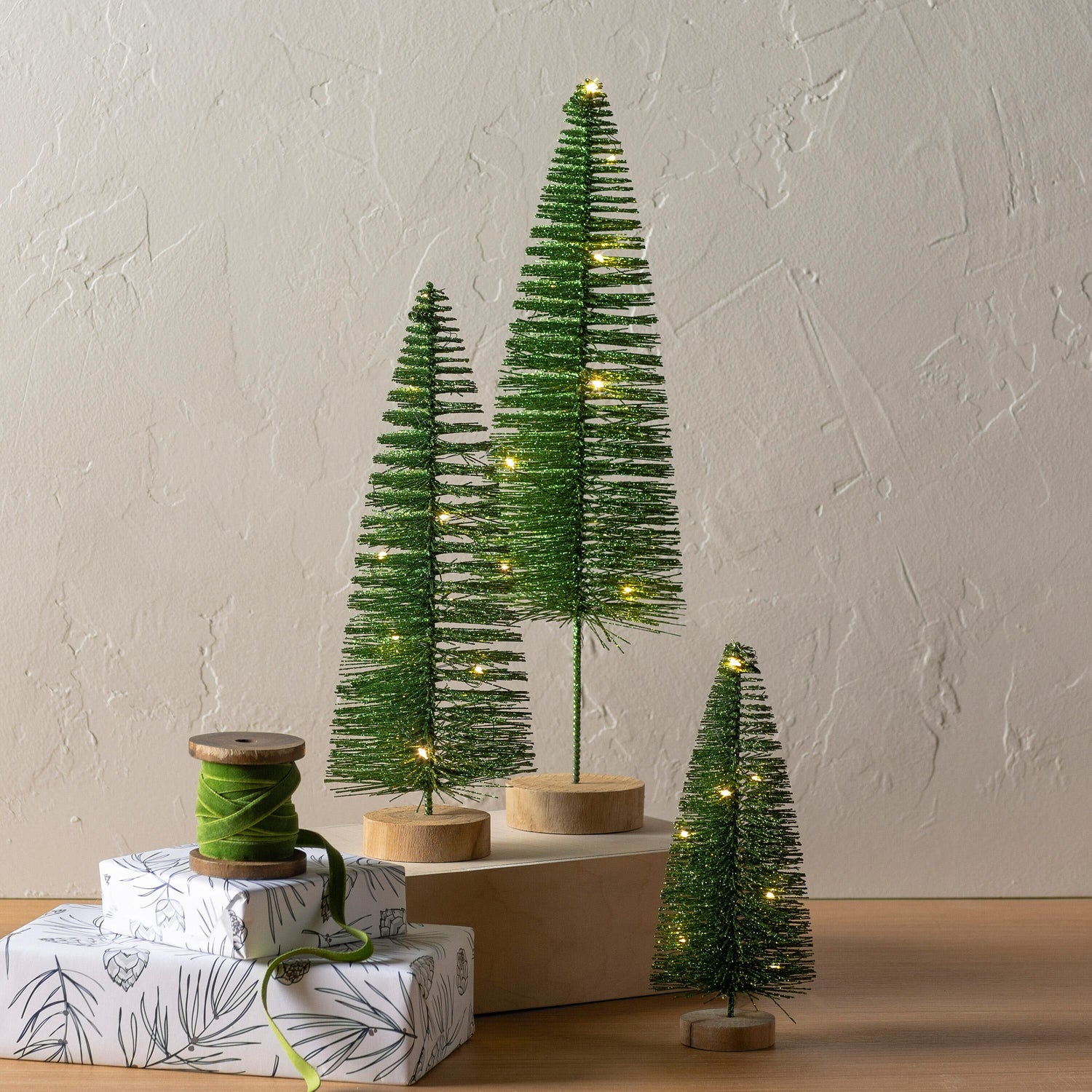 These elegant holiday trees instantly wow with their twinkling lights and graceful design. The natural wood base and dusting of glitter is accented by warm white LEDs. There is a design rule called the Rule of Three that says that three is the magic number when grouping decor items together, and our set of three lighted bottle trees prove this to be true.