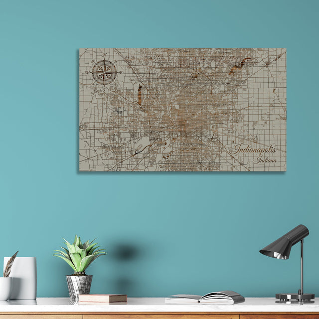 This wood-engraved depiction of Indianapolis, Indiana, transforms high-quality pine wood into a magnificent display of the city's intricate street layout. It's an exceptional piece for anyone who appreciates the distinctive charm of Indianapolis.