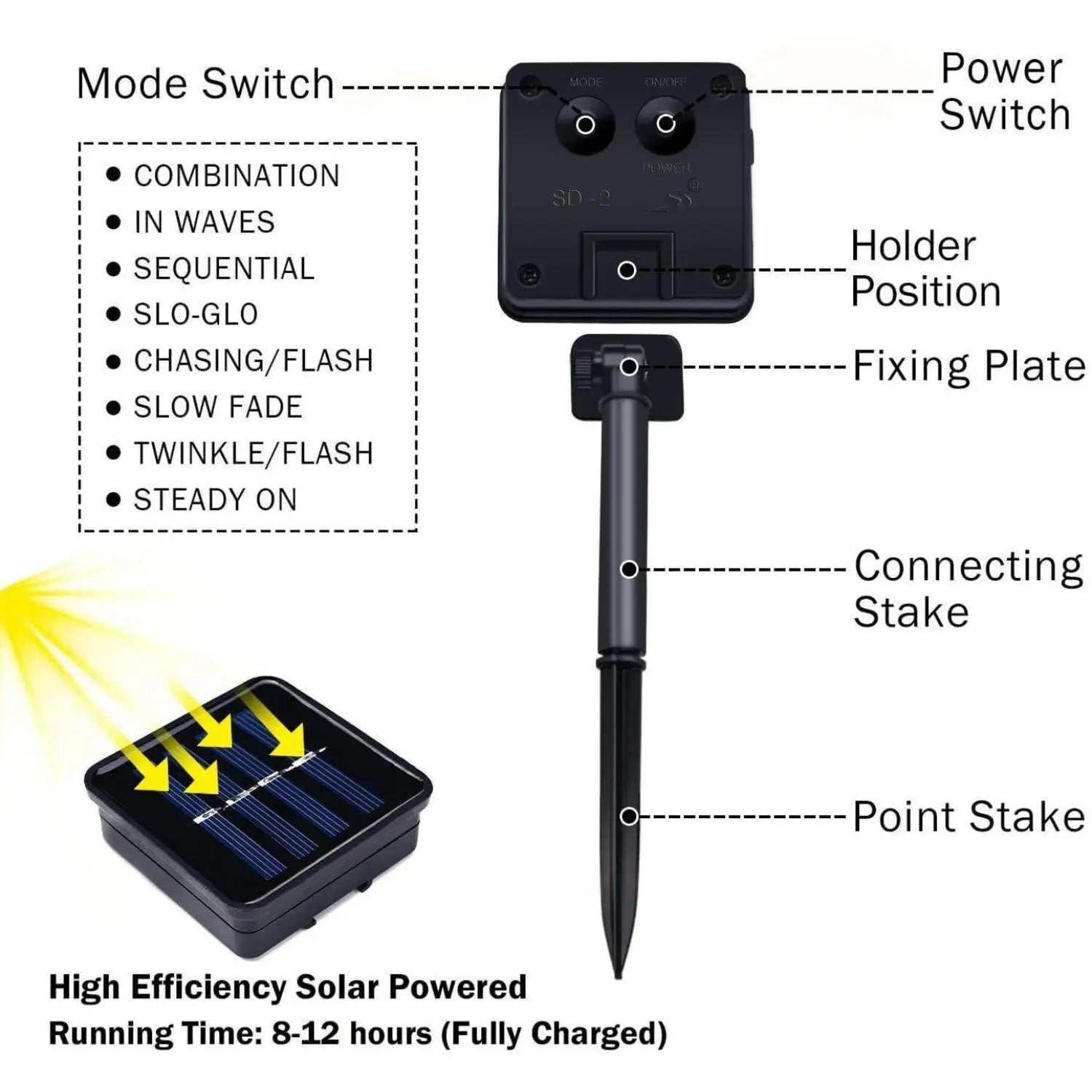 Powered by solar energy with 8 lighting modes for steady or flashing effects.