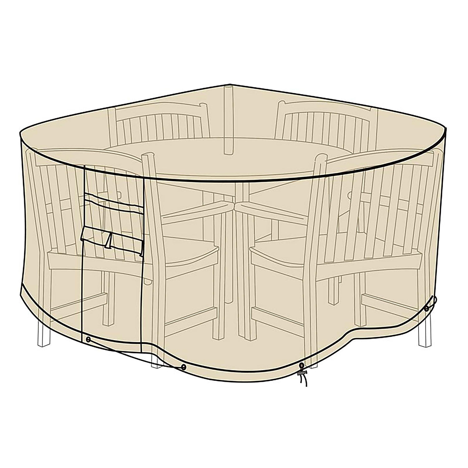 Our outdoor furniture cover has sturdy handles for easy on/off, and elastic toggle ties to keep it secure. The attractive sand color looks great and resists fading. Cover fits most round tables with 4-6 chairs.