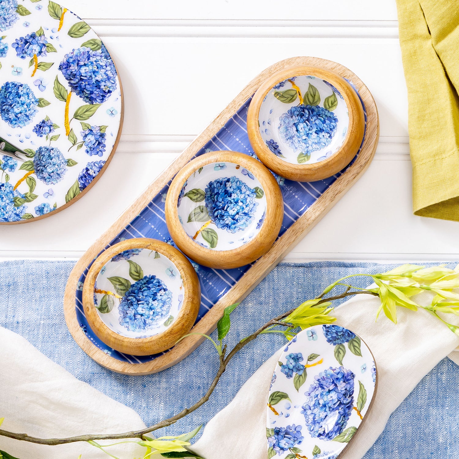 VivaStyle Serveware, 3-Section Wood Server with Bowls, Hydrangea, 13"L