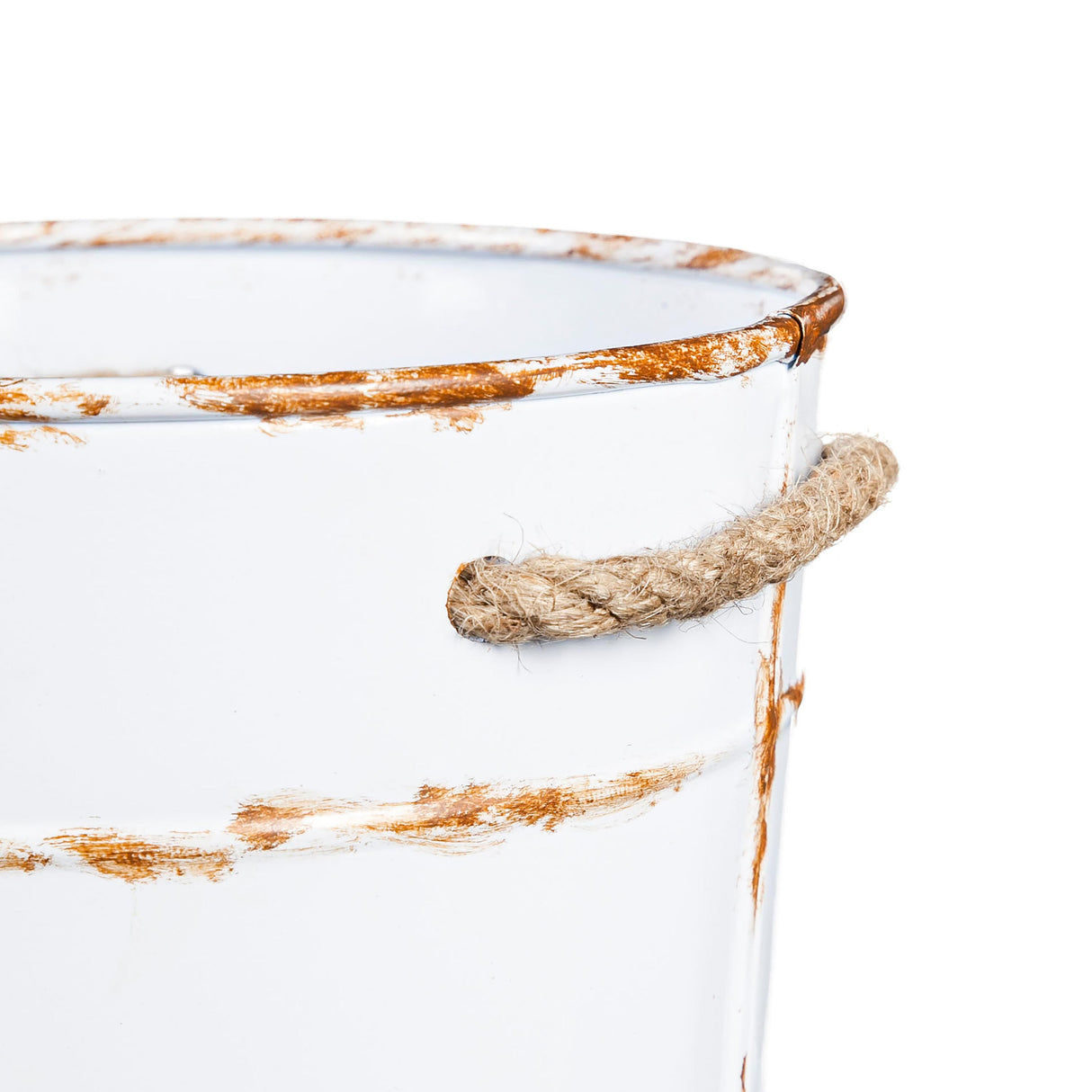 Bring a rustic twist to holiday décor this season with this set of 3 French Buckets. The tall and slender buckets are finished in white with rusted lining for a vintage feel that adds to the shabby-chic look of these buckets. With a jute rope handle detail, each bucket has a different colored tag that says "Merry," "Jingle," and "Holly" for an extra festive touch. Fill the buckets with a tree, plants, kindling wood, or other knick-knacks. The durable iron material is weather-resistant and colorfast to ensure these designs are indoor and outdoor safe. Nest the buckets between seasonal use for easy storage.