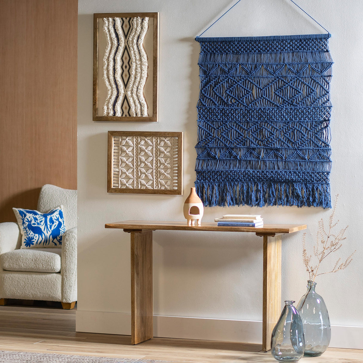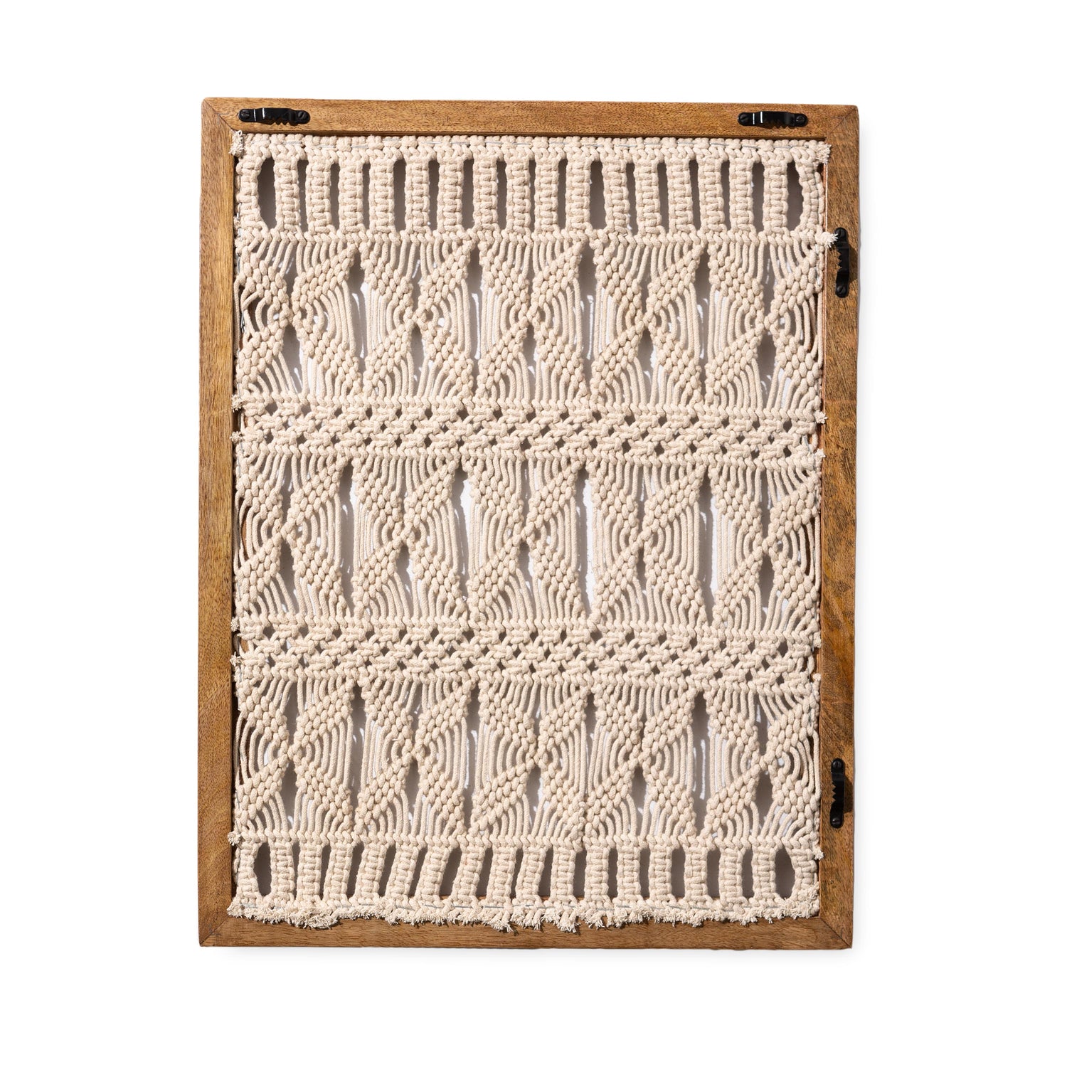 - This sculptural wall hanging contrasts smooth mango wood with soft macrame knots, for an earthy, natural look
