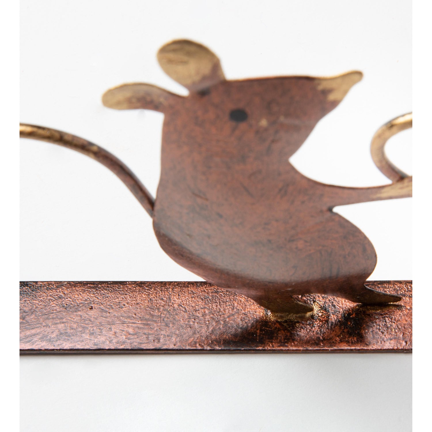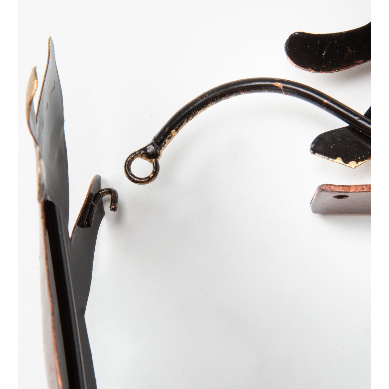 This darling design is handcrafted from reclaimed metal and treated with a dark copper-colored finish with golden highlights. The two parts hook together at the corner of the door or window frame, and the piece can be secured in place with a small tack or brad (not included).