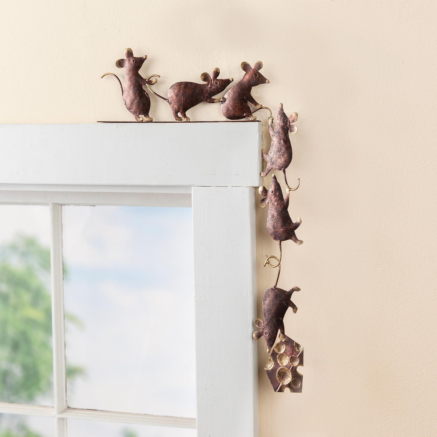 A whimsical decoration that sits on the frame of any door or window, our Metal Mice Door Crawler is an unexpected delight that will liven up your décor. Six metal mice work together in an impressive example of teamwork to make off with some cheese!