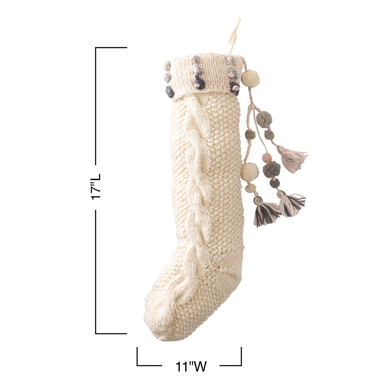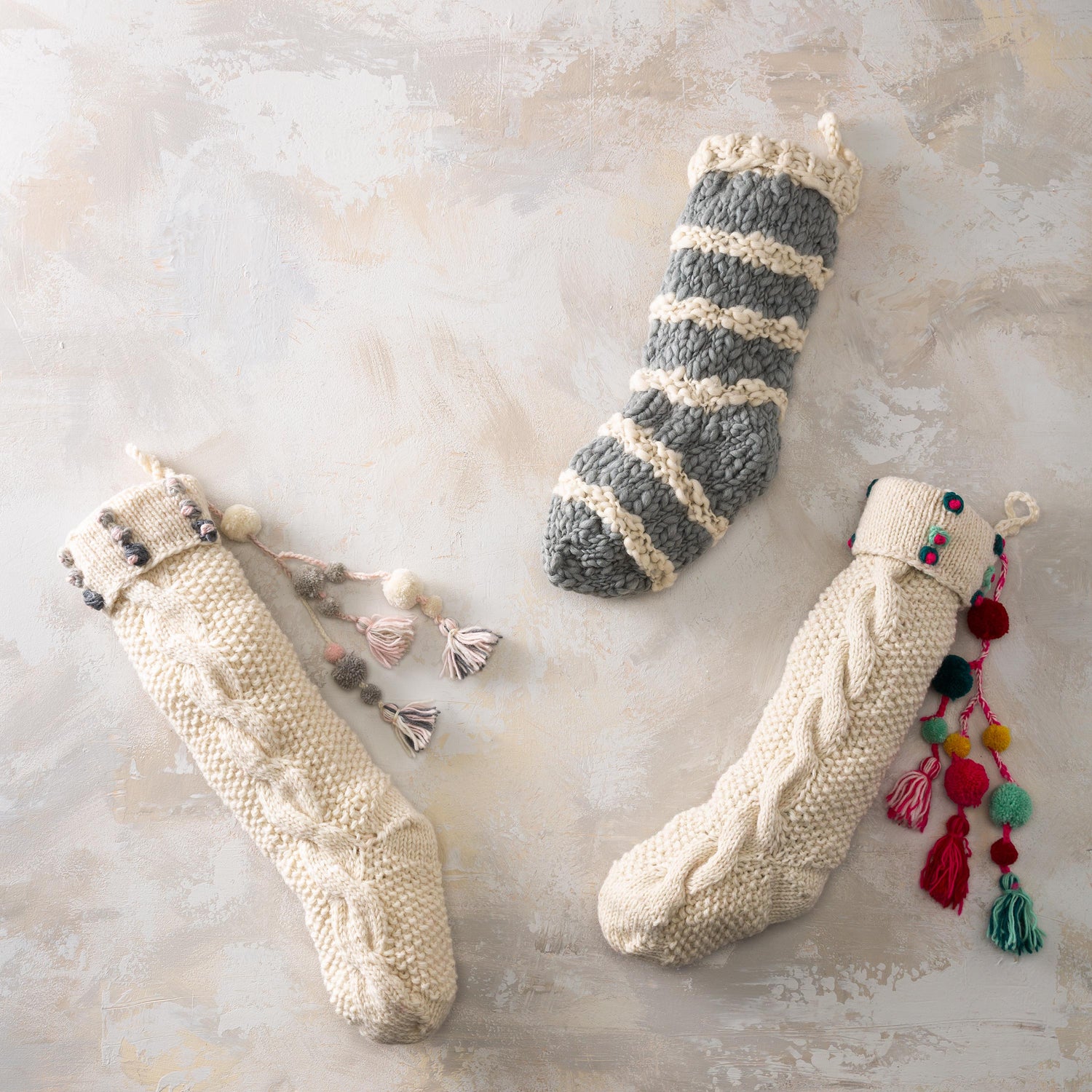 Evoke a vintage holiday feel to your mantel with these classic holiday stockings. The chunky, hand-knit wool, pom and tassel decoration, and braided hanging loop brings comfort and coziness to your holiday style. Each is handmade and ready to be filled with tiny treats, treasures, and trinkets. Hangs from a 5" loop. Handcrafted in Nepal by our artisan partners.