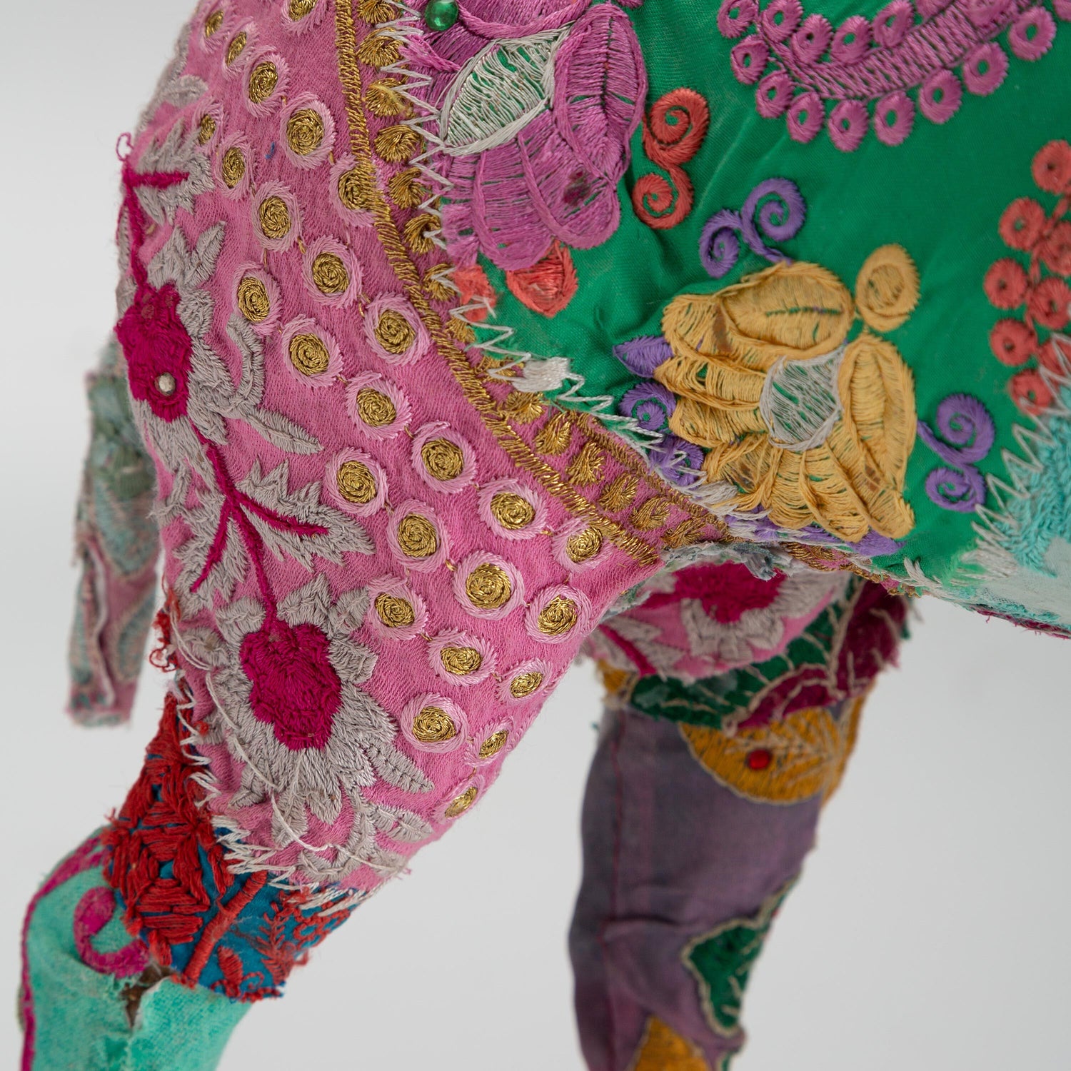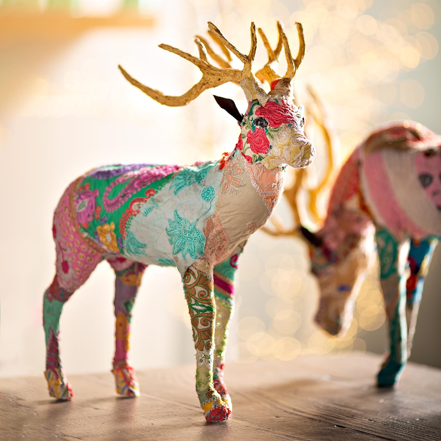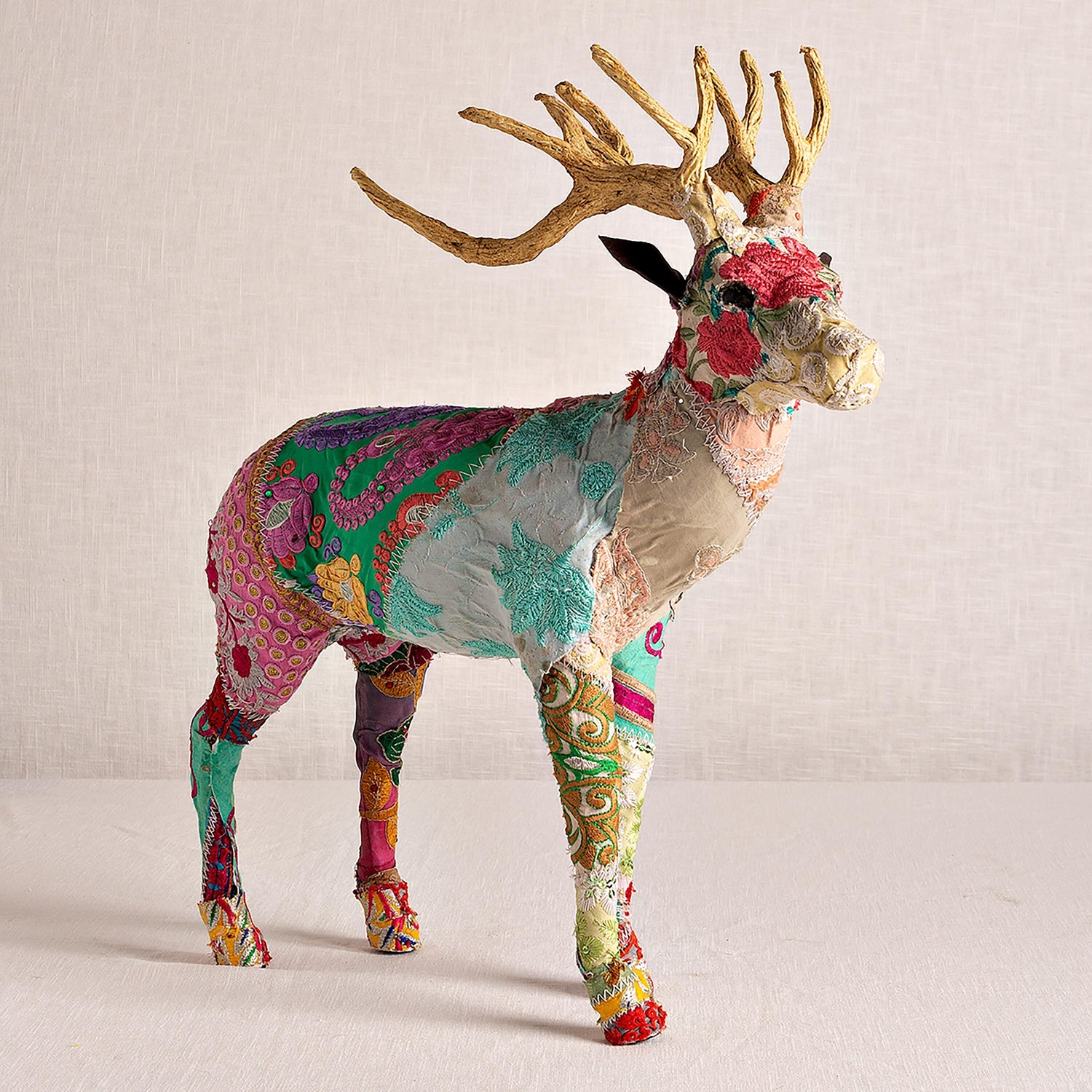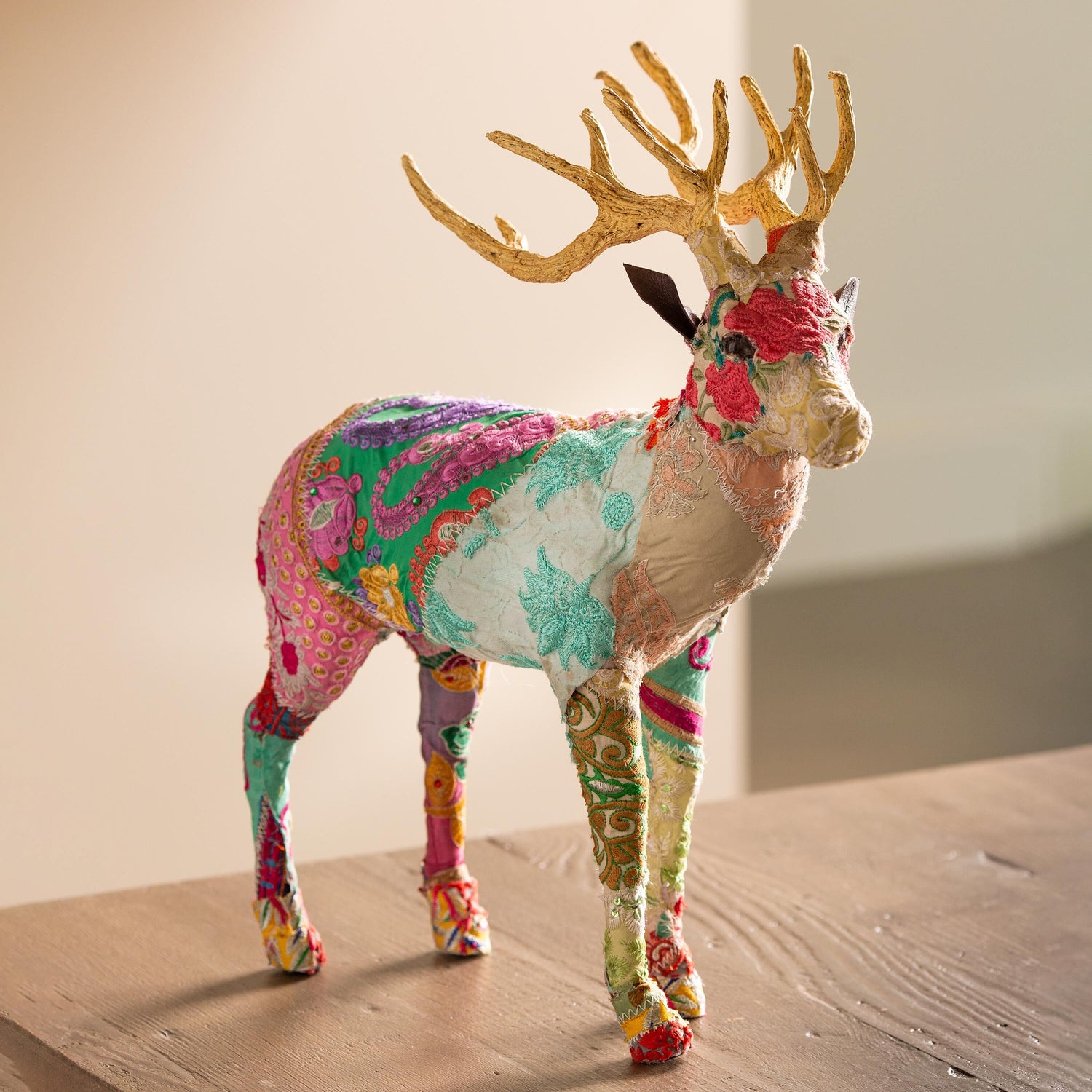 - Artisans in India handcraft this distinctive standing stag from natural fiber forms wrapped in embroidered vintage sari fabric in colorful tones