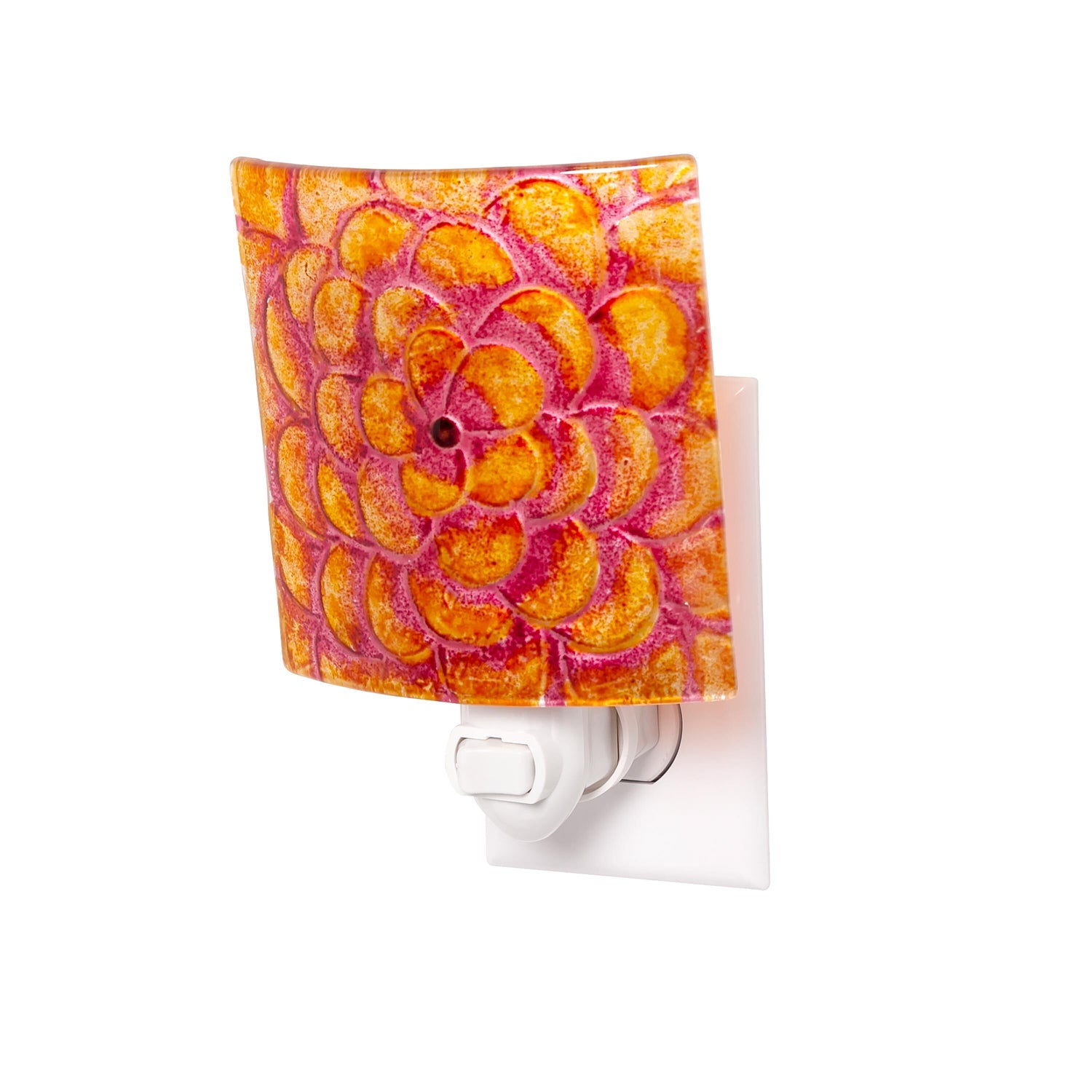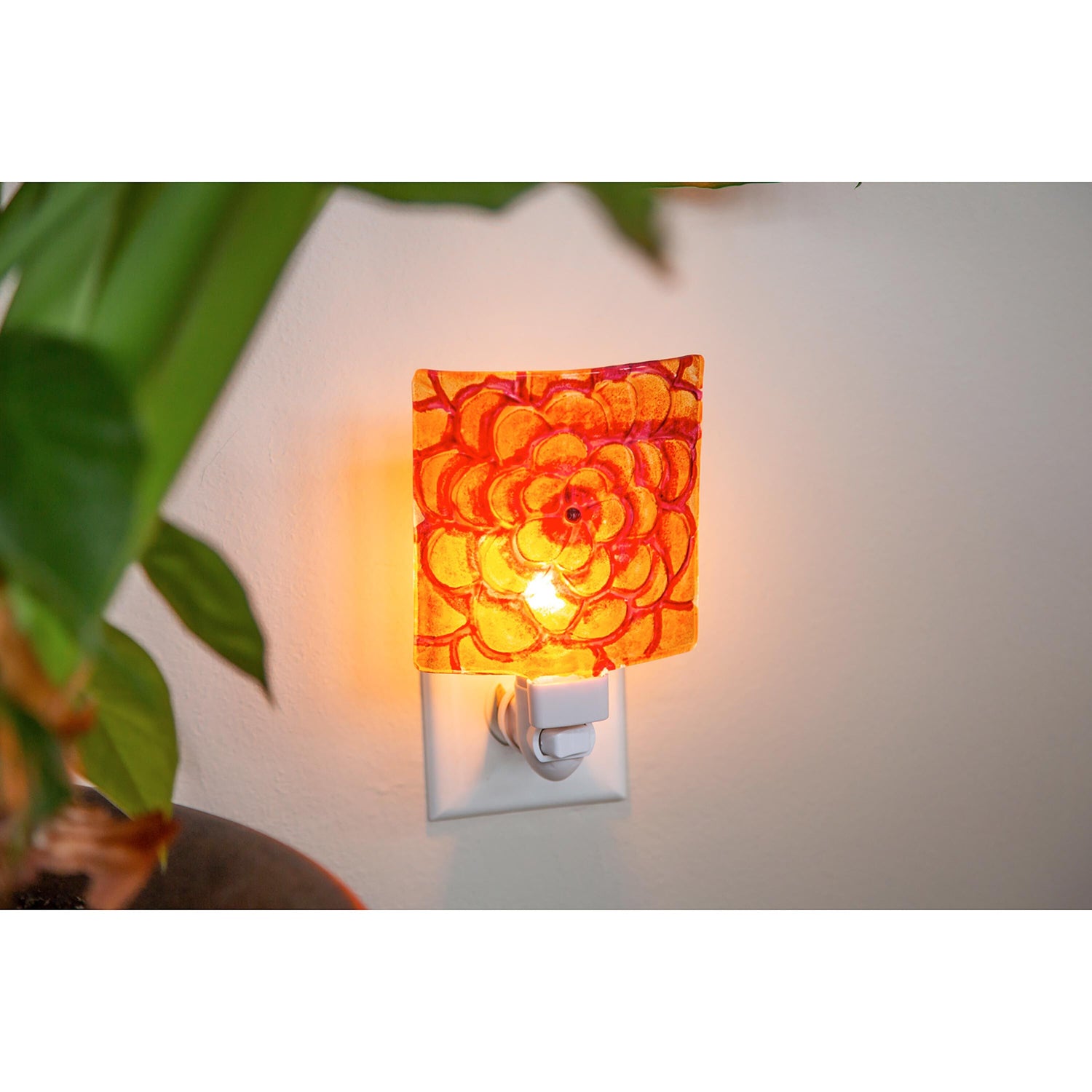 Featuring a bold, hand-painted floral design in vivid shades of orange and red, this curved glass night light casts a soft, comforting glow when plugged in. Perfect for hallways, bathrooms, kitchens, or bedrooms, it adds a touch of artisan beauty while offering practical illumination.