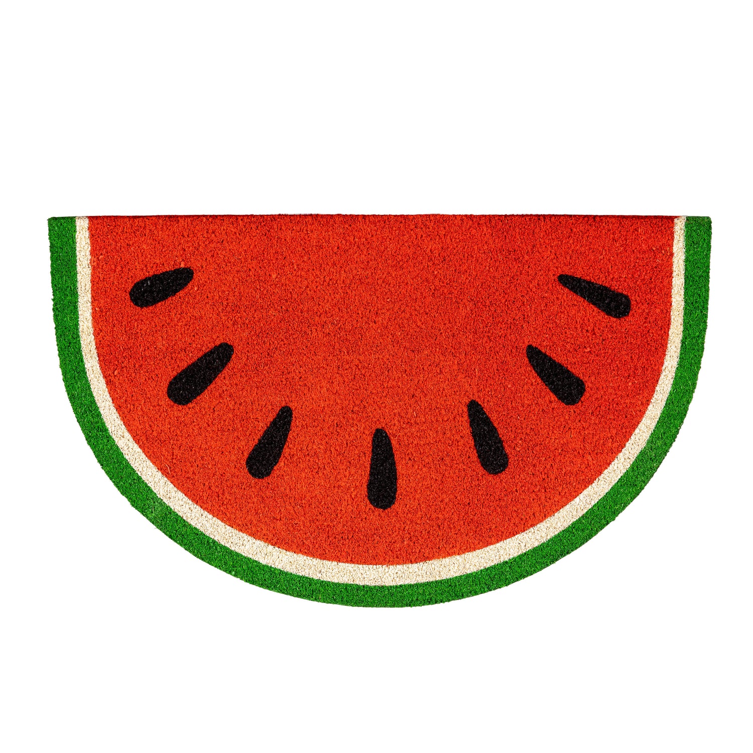 Shaped like a vibrant slice of watermelon with bold red, green, and black detailing, this fun half-round mat brings tropical vibes and playful personality to your doorstep. Made from durable natural coir fiber, it’s as functional as it is fresh.